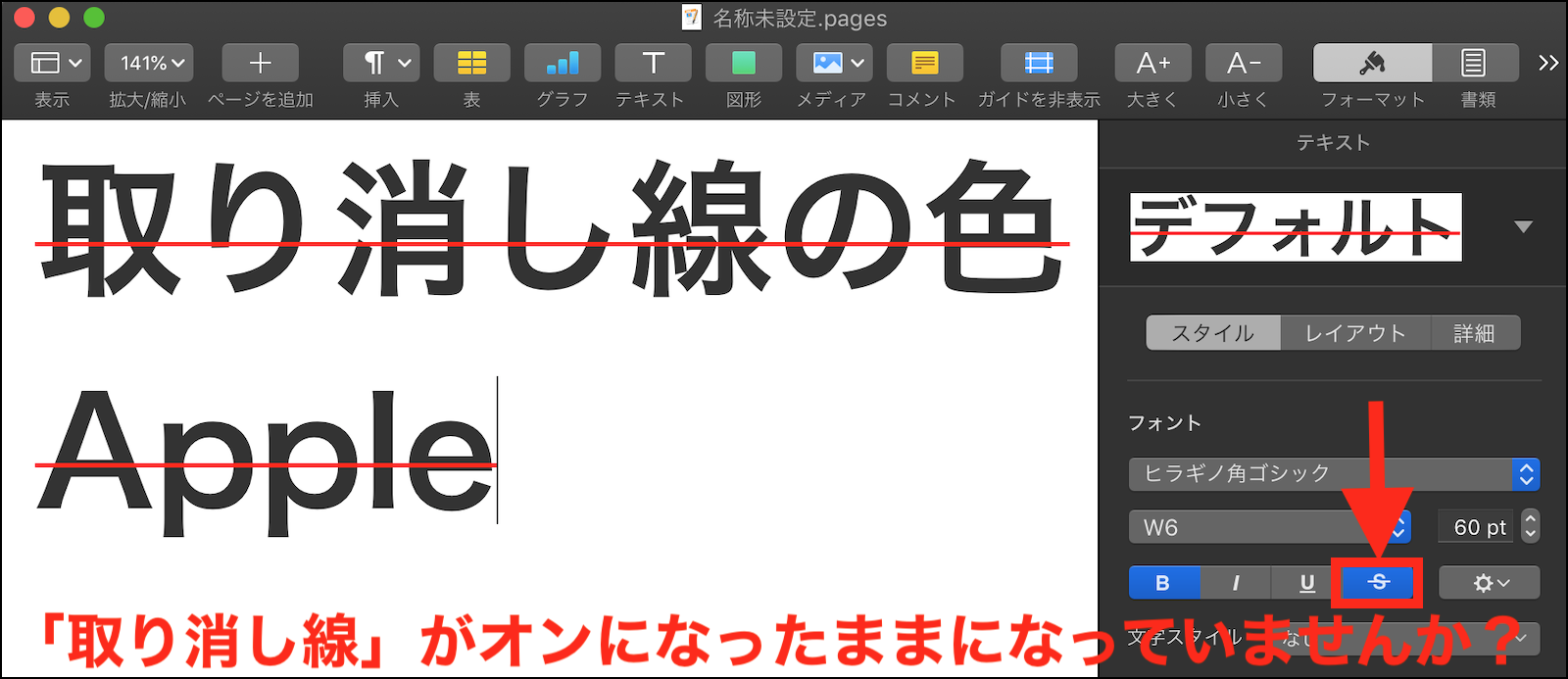 もしかして下の画像の様に、「フォーマット」インスペクタ >「スタイル」タブ >「フォント」の「取り消し線」ボタンが、オンになったまま使用されていませんでしょうか?