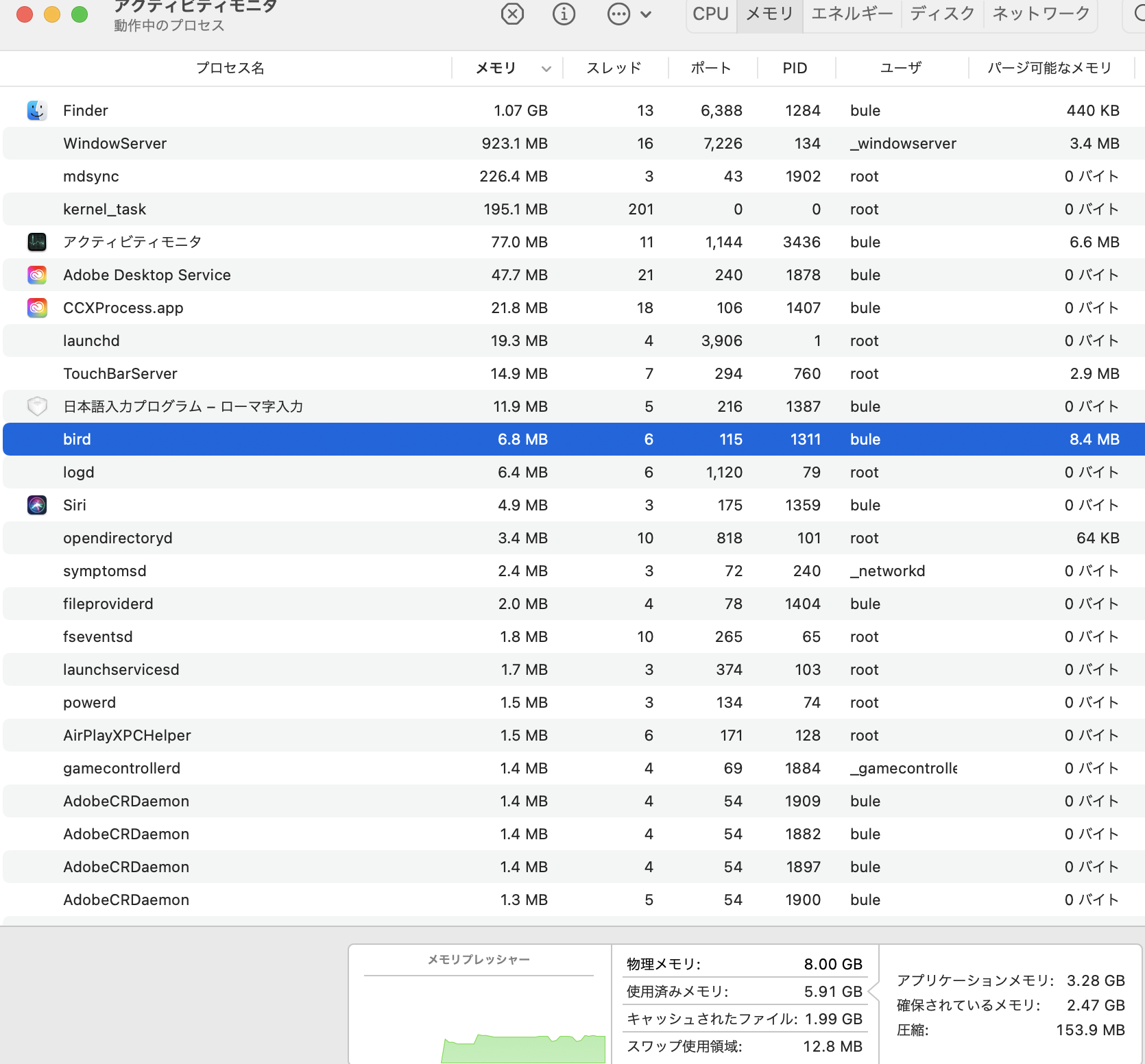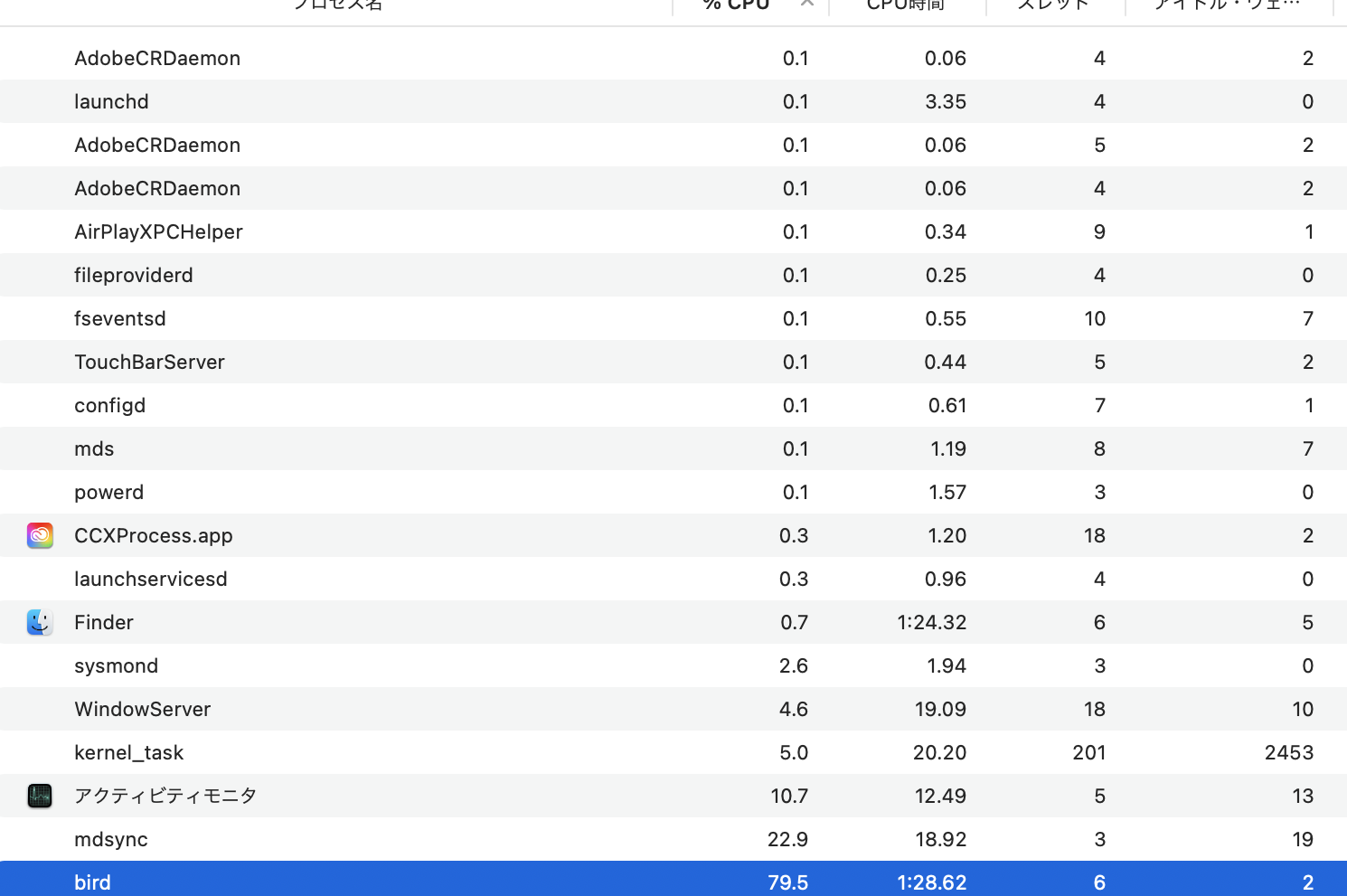 cpuは、bird、mdsyncというプログラムが合わせてほぼ100%で動いていて