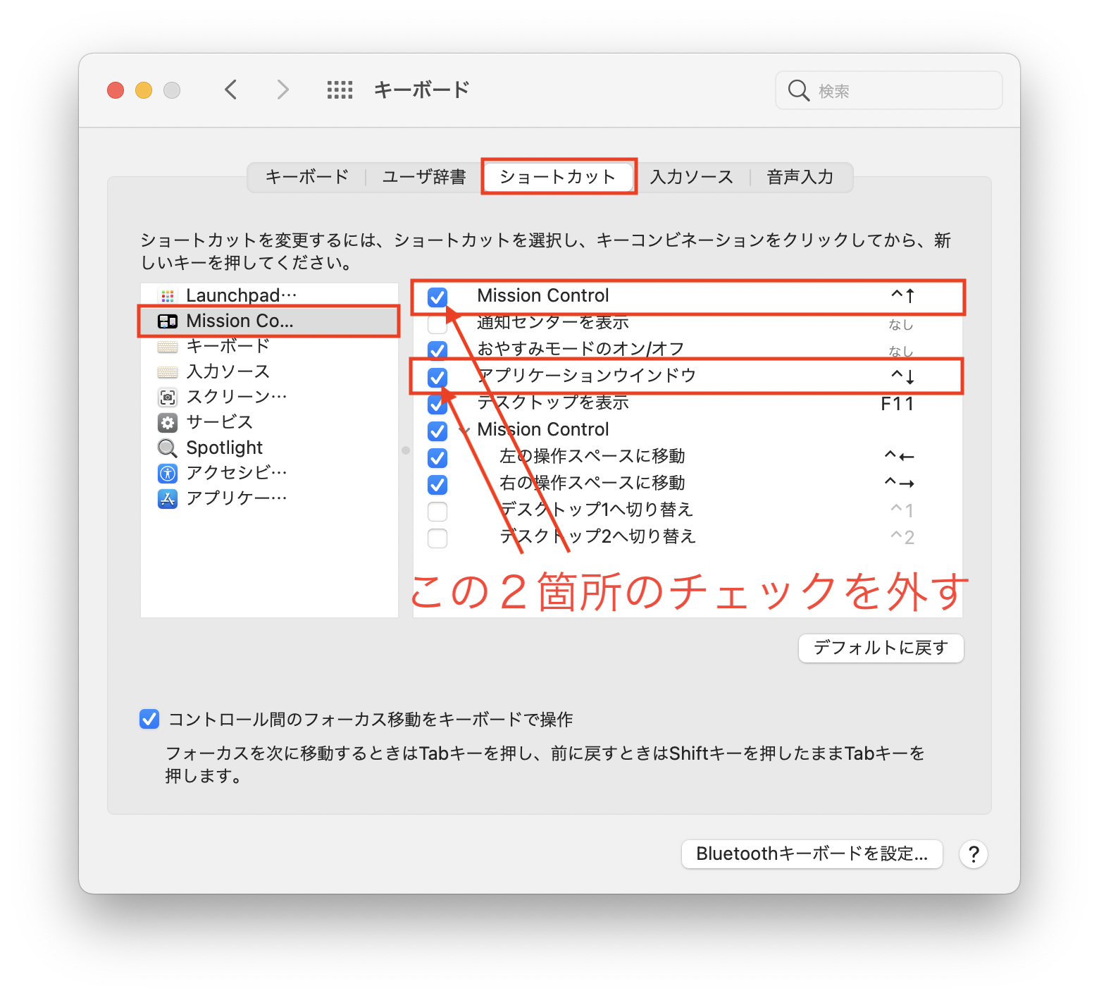 「システム環境設定>キーボード>ショートカット>Mission Control」で2箇所のチェックを外してください。