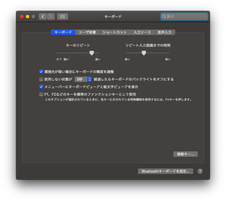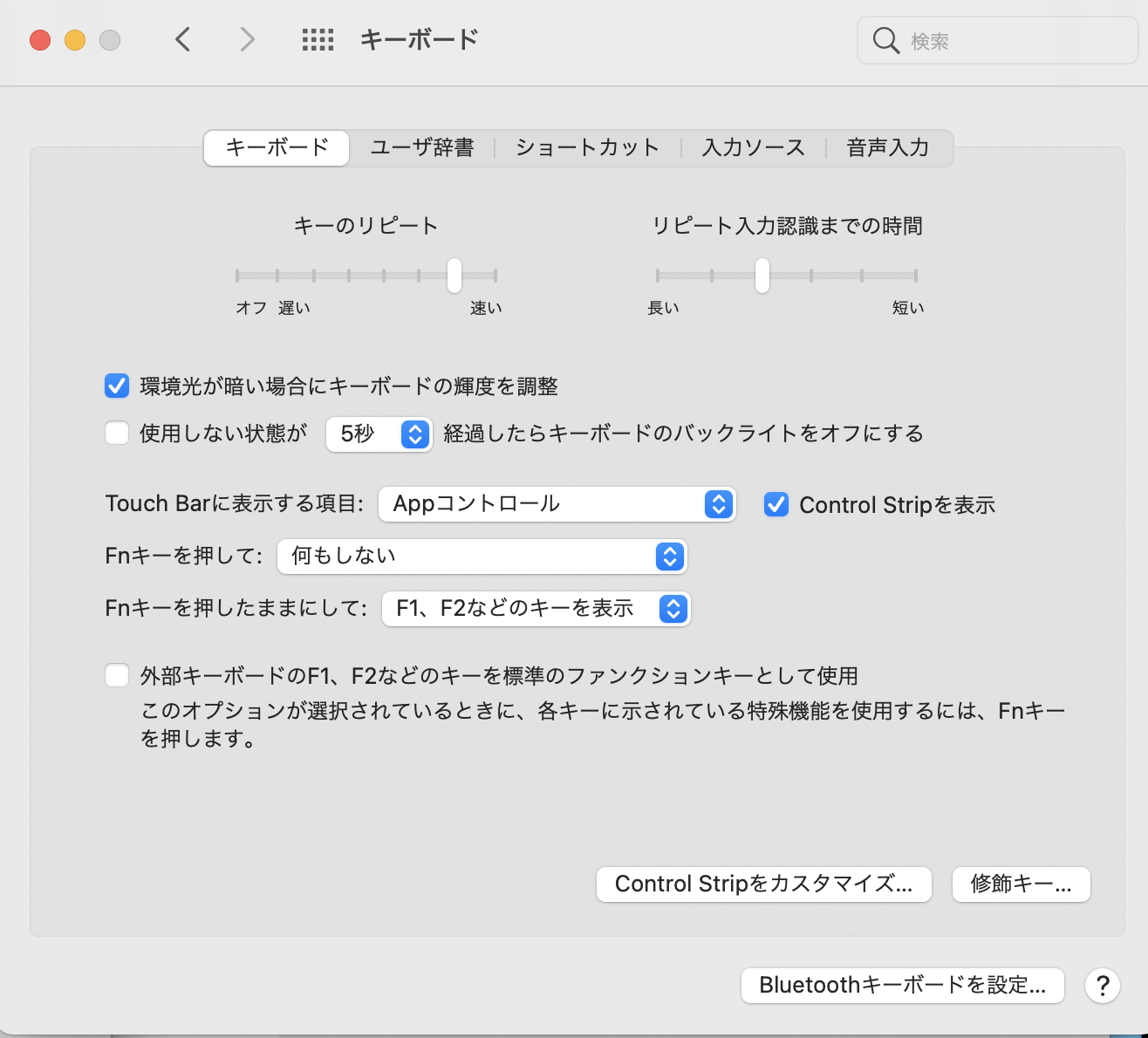 「システム環境設定」>「キーボード」>「キーボード」タブの表示内容は、私のMacはTouch Bar非搭載のためお示しのものよりシンプルです。ハードウェアが大きく異なり参考にならないと思いますがスクリーンショットです。