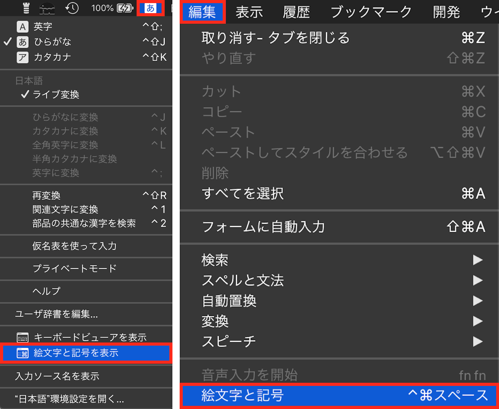 enjoyw さんが添付して下さったスクリーンショットにも表示されていますが、下の画像左側の様に、メニューバーの「入力ソース」アイコンをクリックすると表示されるメニューから、「絵文字と記号を表示」を選択 するか、「編集」メニュー >「絵文字と記号」を選択、または 「control」+「command」+「スペース」キーで「文字ビューア」を表示 させています。