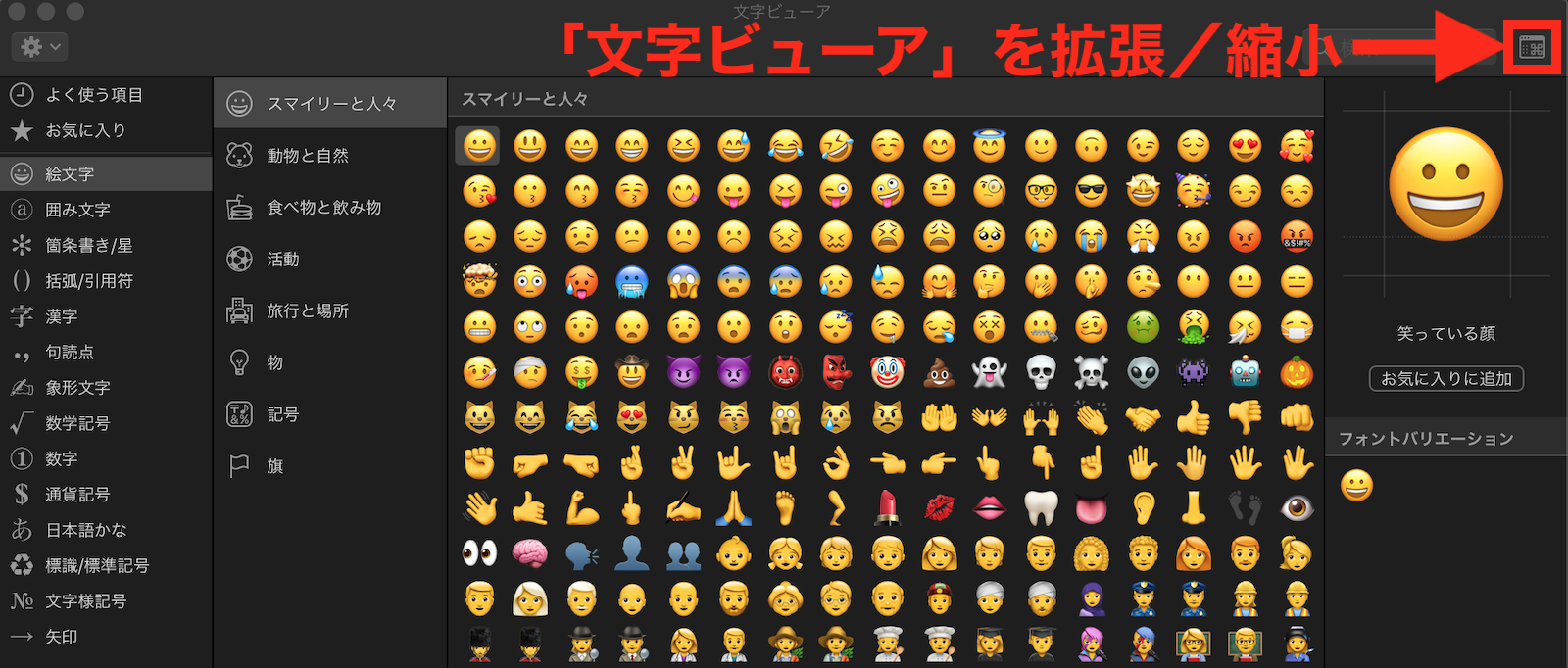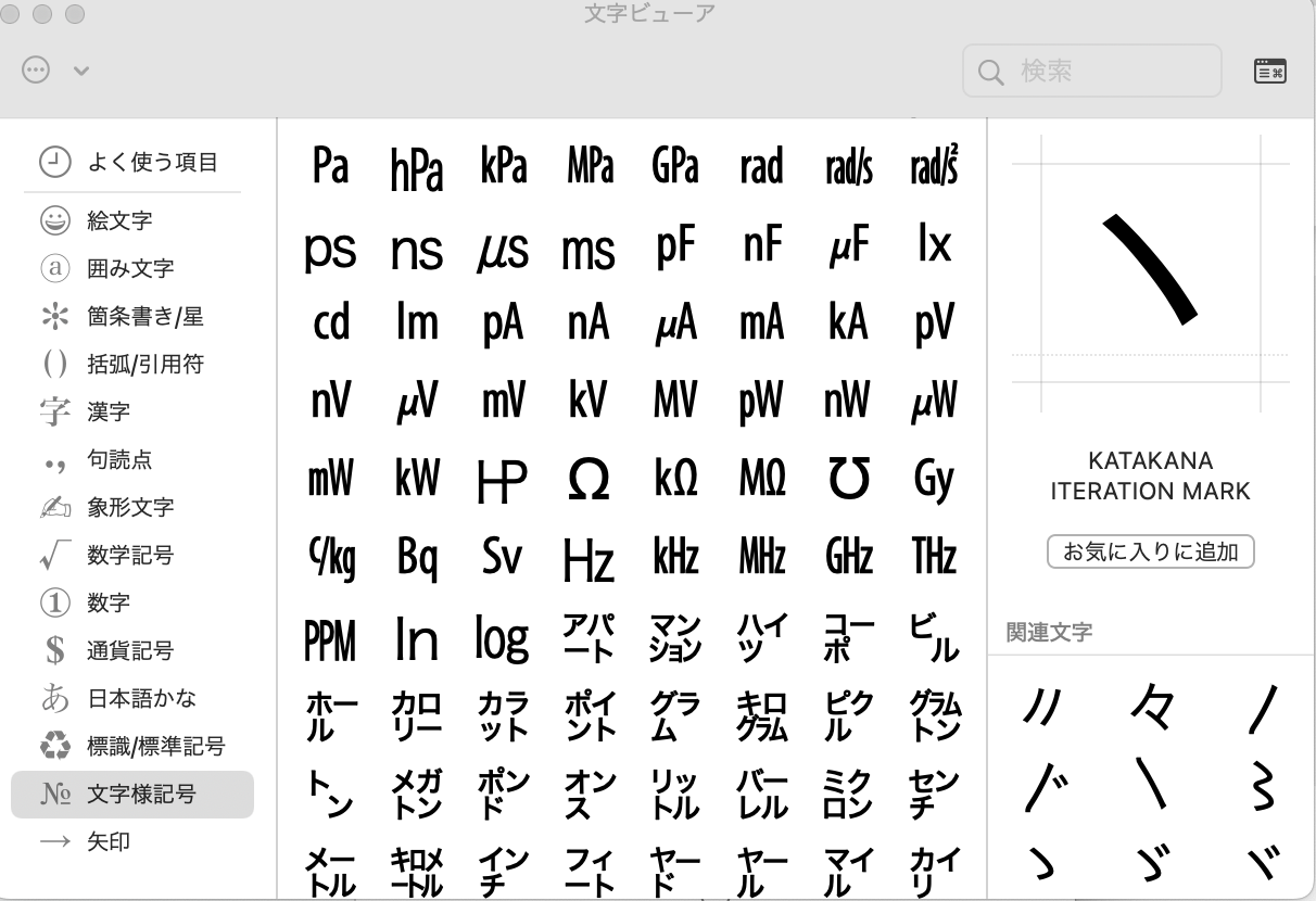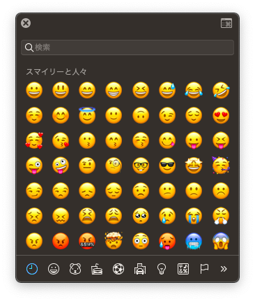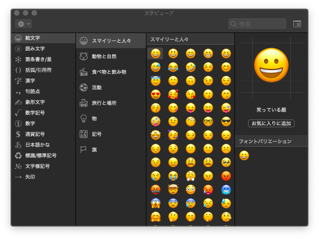 「編集」メニュー >「絵文字と記号」を選択、または 「control」+「command」+「スペース」キーで「文字ビューア」を表示する場合は、前回の表示が維持 されます。