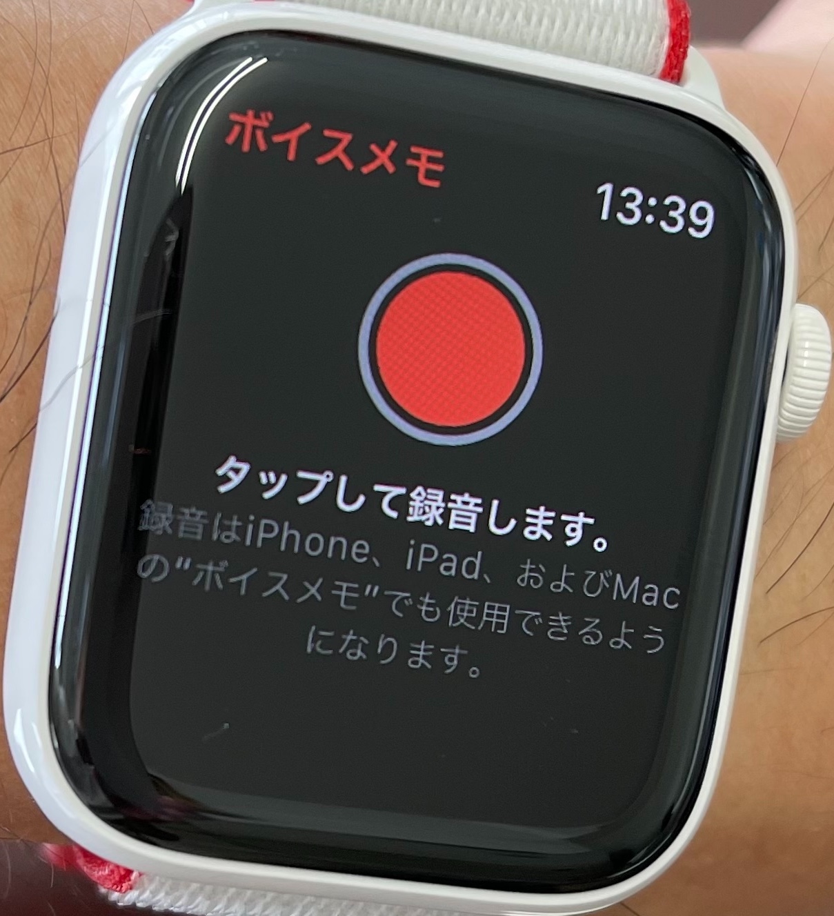 Apple Watchのボイスレコーダーに、写真の下部に表示されている「録音はiPhone、iPad、および・・・」と表示されていますか?たいがい、同期されていないときは表示されていないことが多いです。