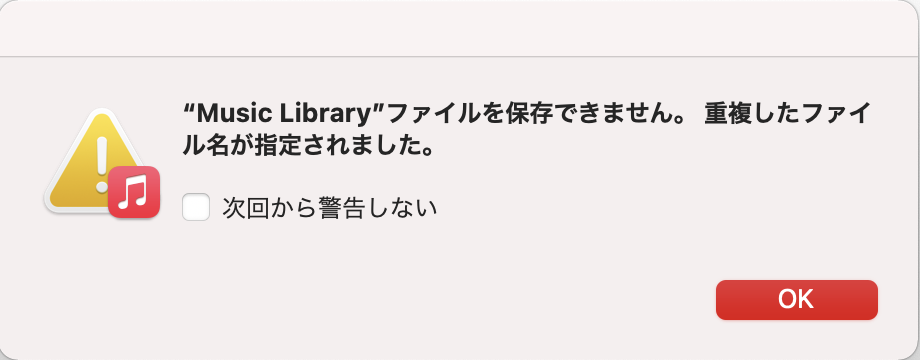 ミュージックを利用中に「"Music Library"ファイルを保存できません。」のダイアログが表示されました。