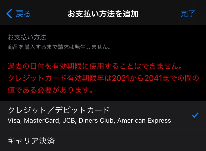 iPhone の App Store でカードをお支払い方法に追加する際に、有効期限に関するエラーが表示されるということですね。