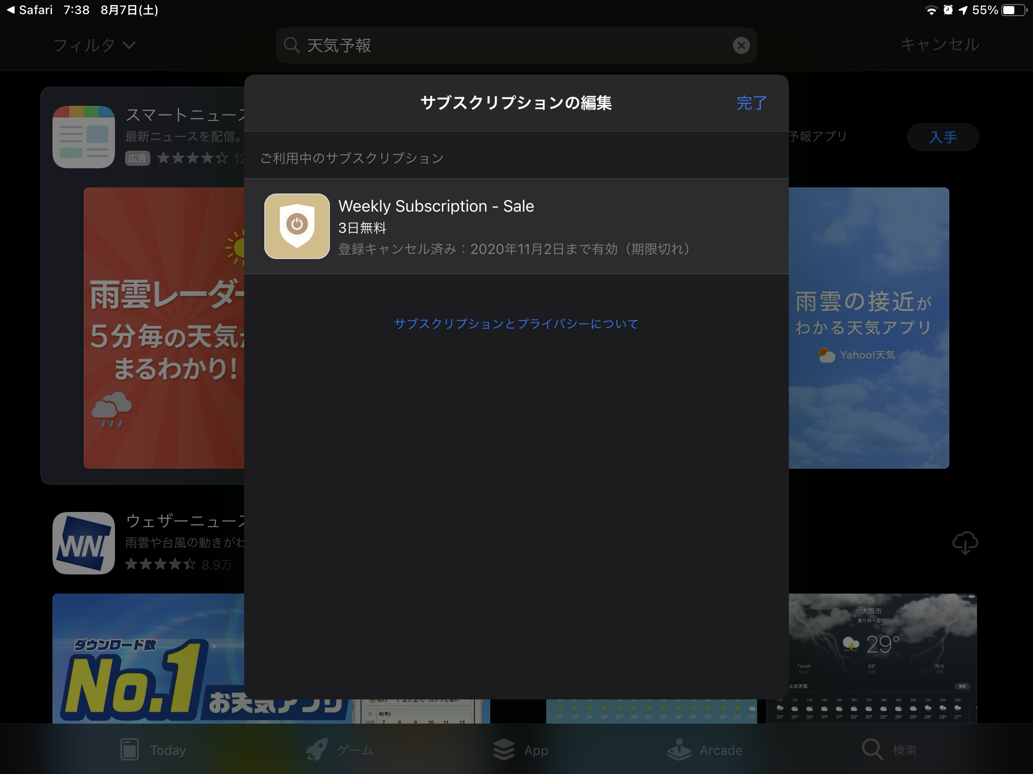 天気アプリ サブスクリプションからキャンセルが出来ません。