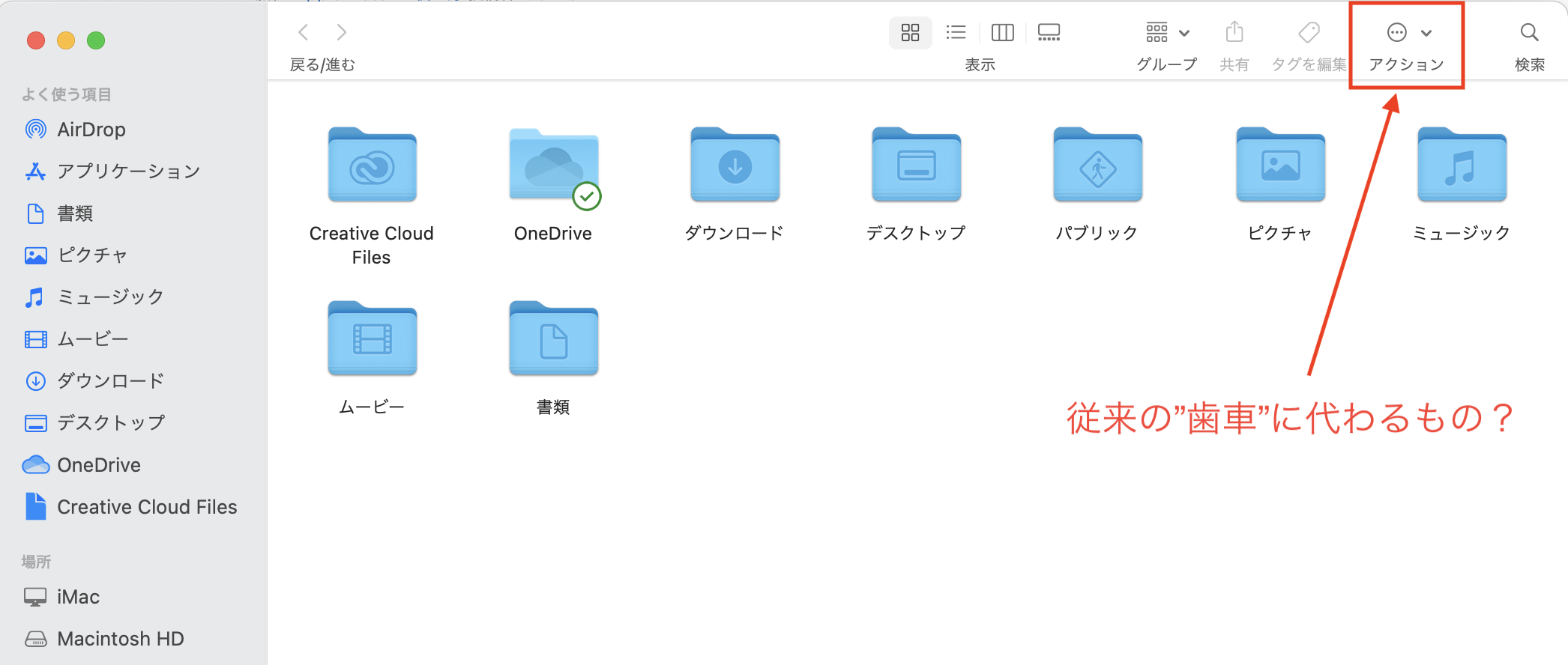 戻ってFinderなどから見たところ、やはり、歯車マーク自体が見つかりません。