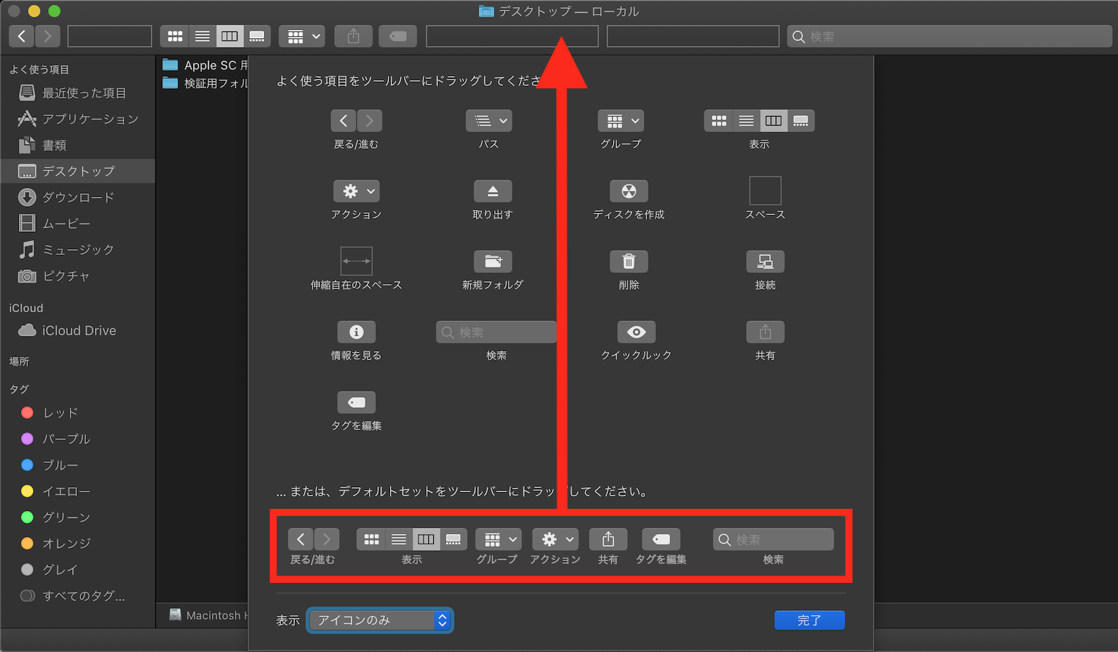 Finder→環境設定や、表示→ツールバーのカスタマイズなども試しました。