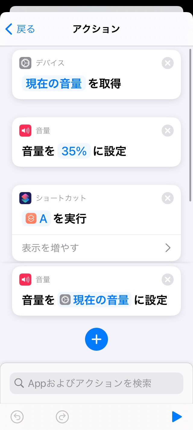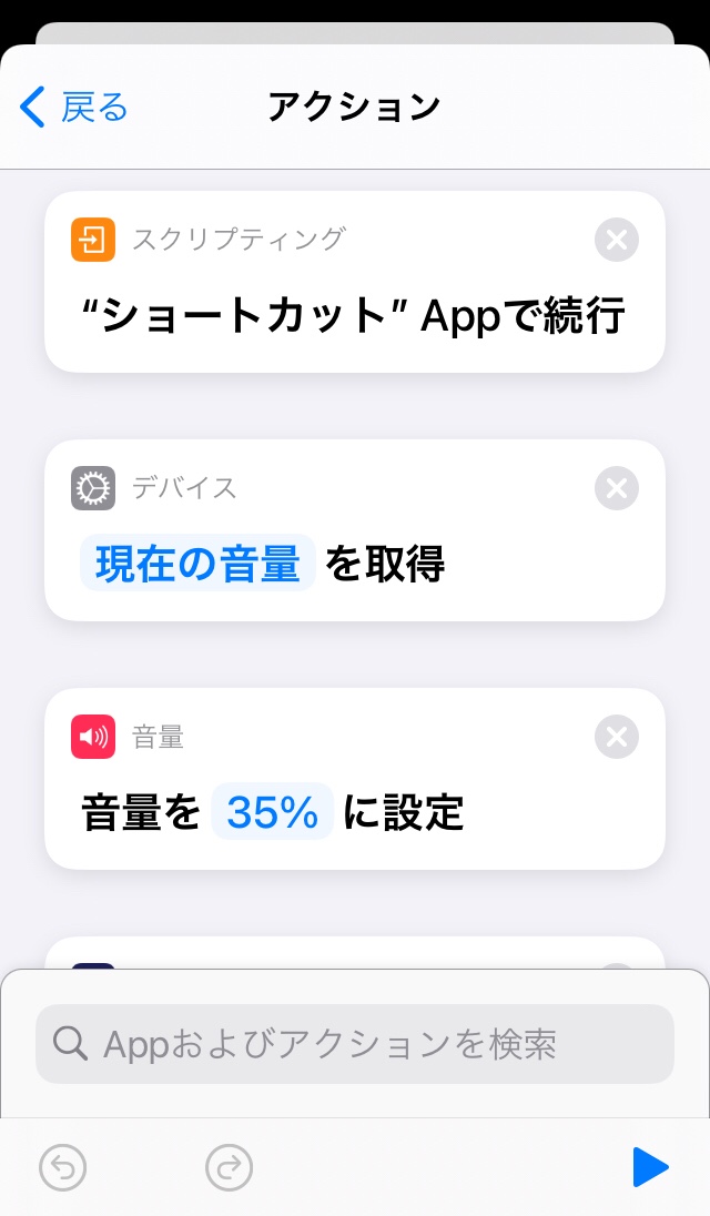 添付写真のレシピの冒頭(現在の音量を取得の上)に、「“ショートカット”Appで続行」を追加