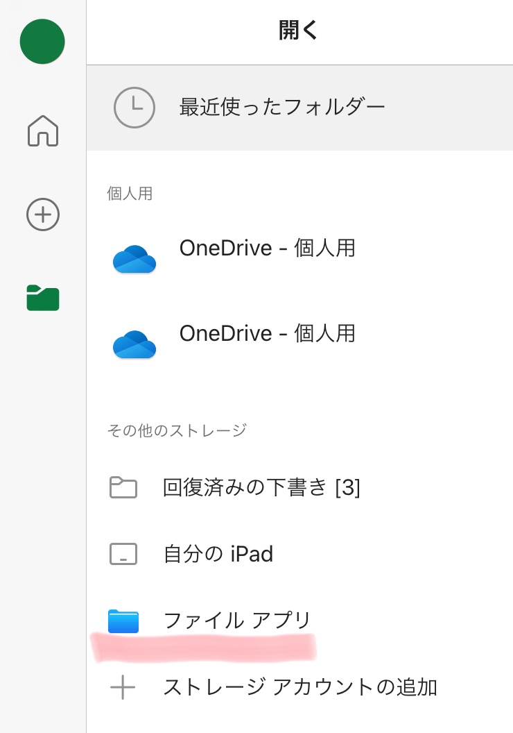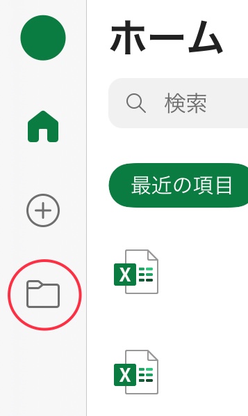 Excelの場合、ホームアイコンの下にあるフォルダアイコンからアクセスできます。
