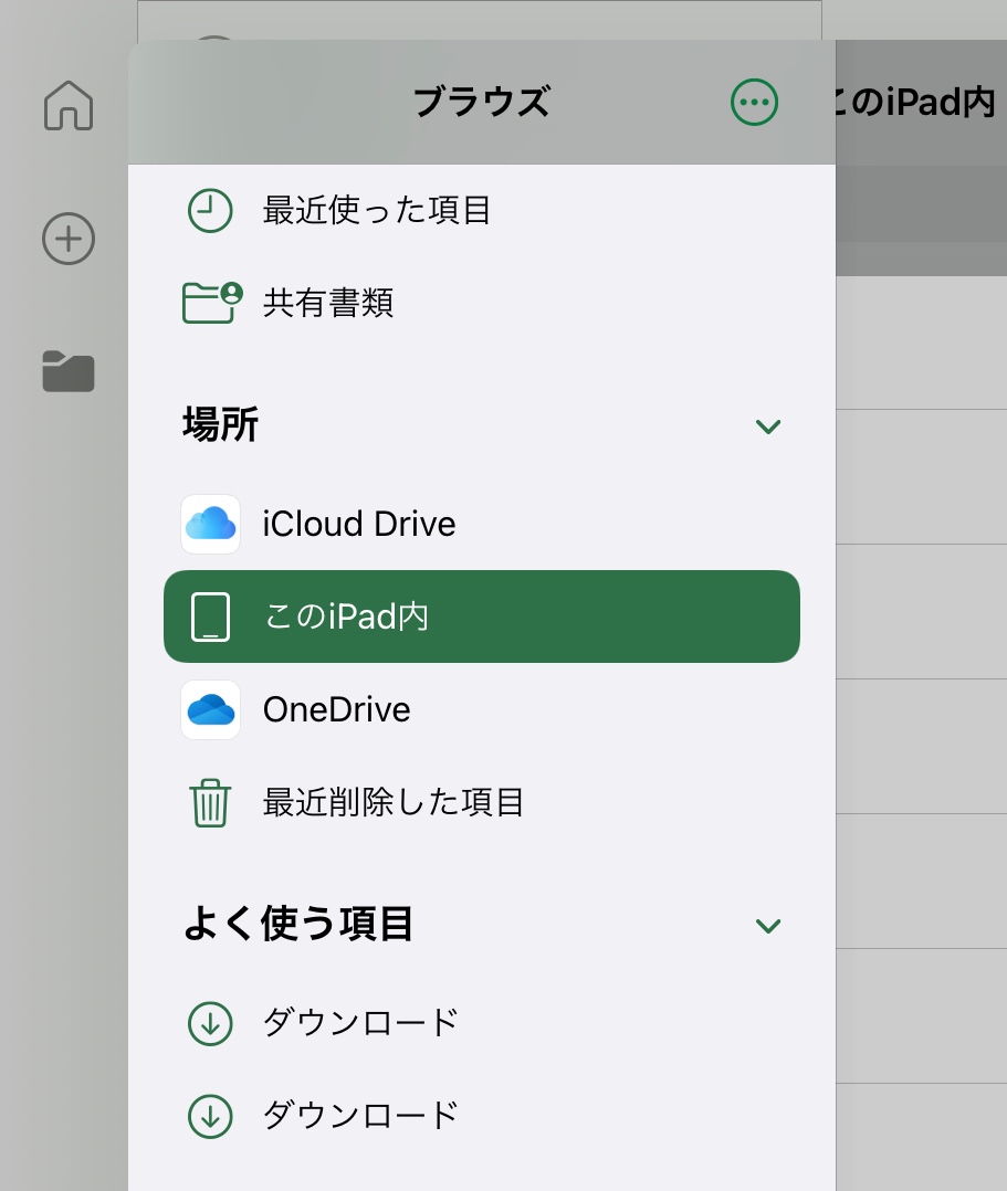 アプリによっては同じ様な操作でアプリから直接iCloudDrive内や端末内のフォルダとファイルにアクセスできるものもあります。Excelなどはこの操作ができます(後述)。