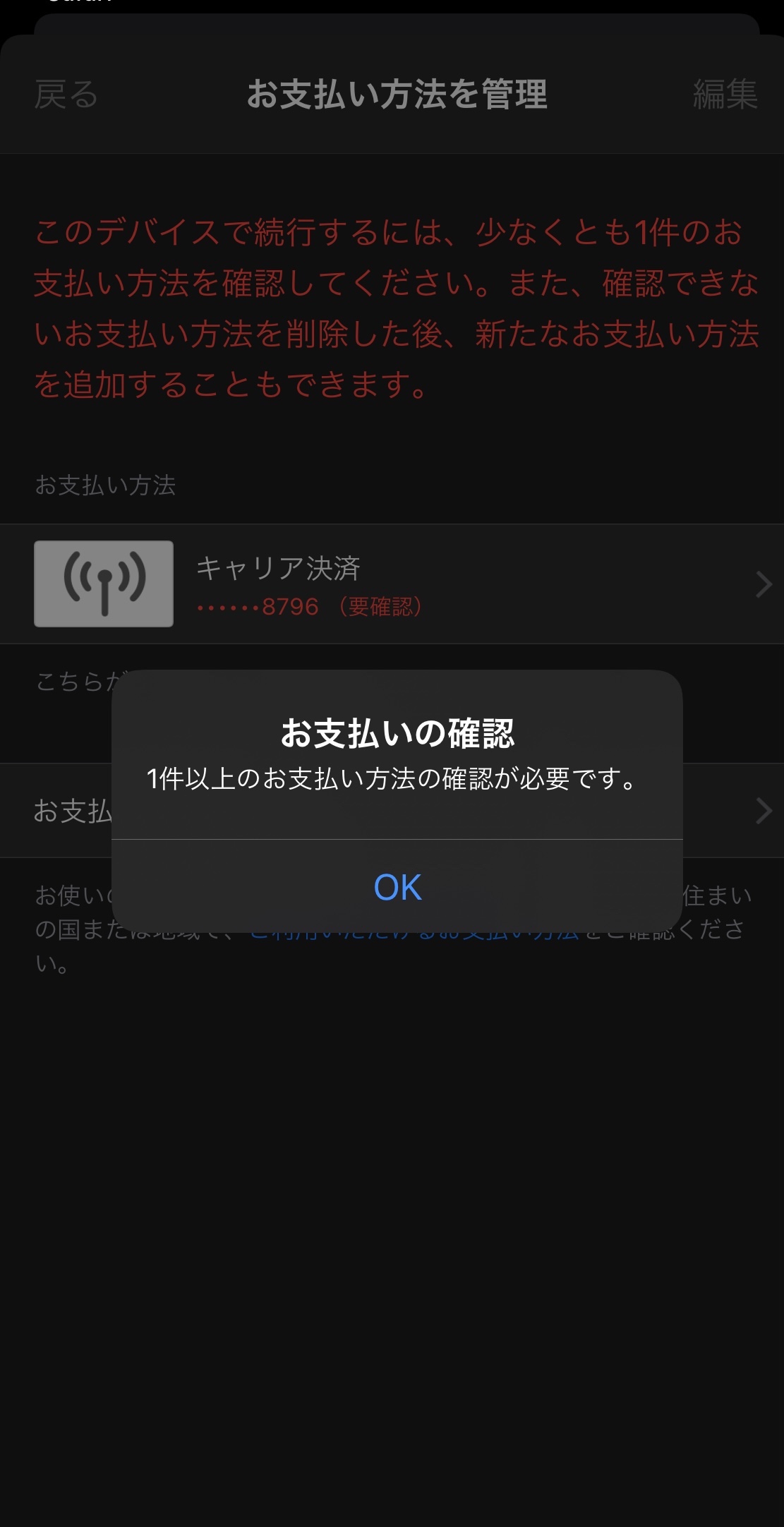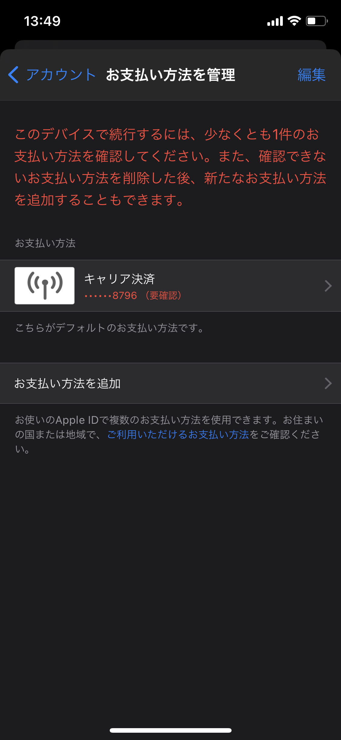 このディバイスで続行するには、少なくとも1つのお支払い方法をご確認ください。