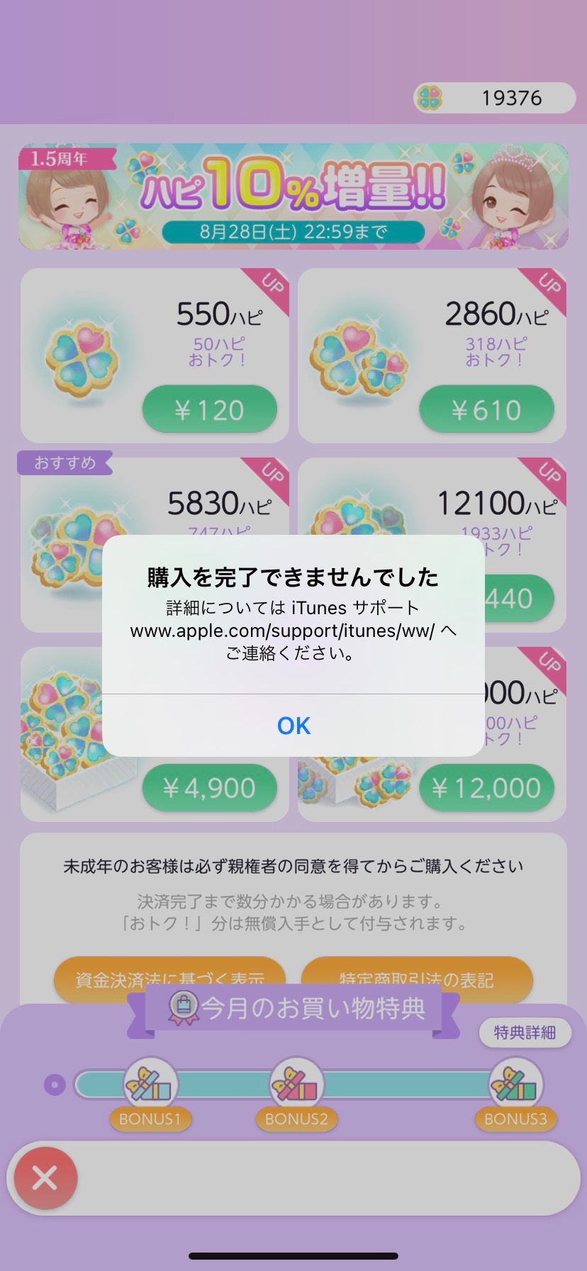 「購入を完了できませんでした。詳細についてはiTunesサポートへご連絡ください」と出てしまったのですね。