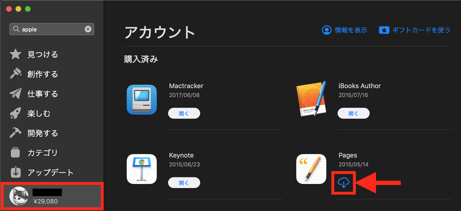 「」メニュー >「App Store」を開き、サイドバーの一番下に有る sai65 さんのアカウントを選択すると、下の画像の様に「Pages」の「開く」ボタンがダウンロードアイコンに変わっていますので、クリックして再インストールし、起動出来るか確認して見て下さい。