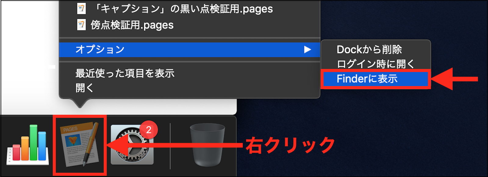 念の為、下の画像の様に、起動出来ない Dock(アプリケーションのアイコンが並んでいる場所)上の「Pages」アイコンを右クリック(2本指でクリック)すると表示される、ポップアップメニューから、「オプション」>「Finder に表示」を選択し、