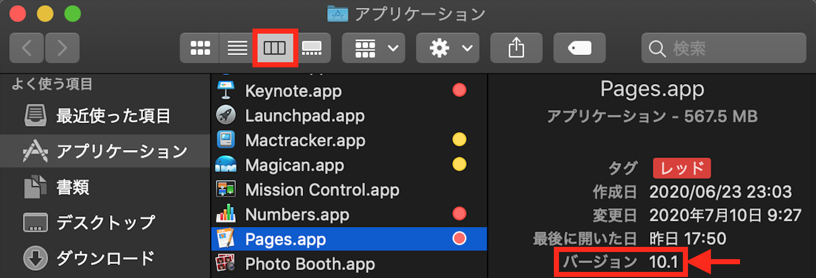 「Finder」を「カラム表示」にすると、下の画像の様にプレビュー欄で「Pages」のバージョンが確認出来ます。