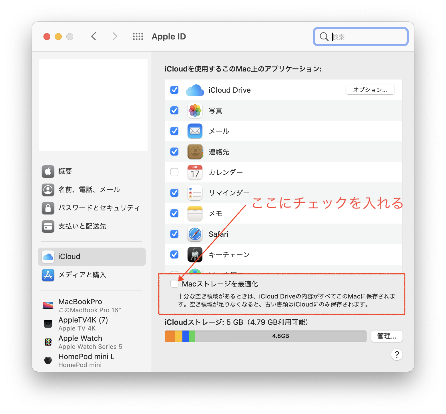 それから、あえてmacにiClouddriveの内容コピーをしないように、この「Macストレージを最適化」のフラグをはずすようにしました。