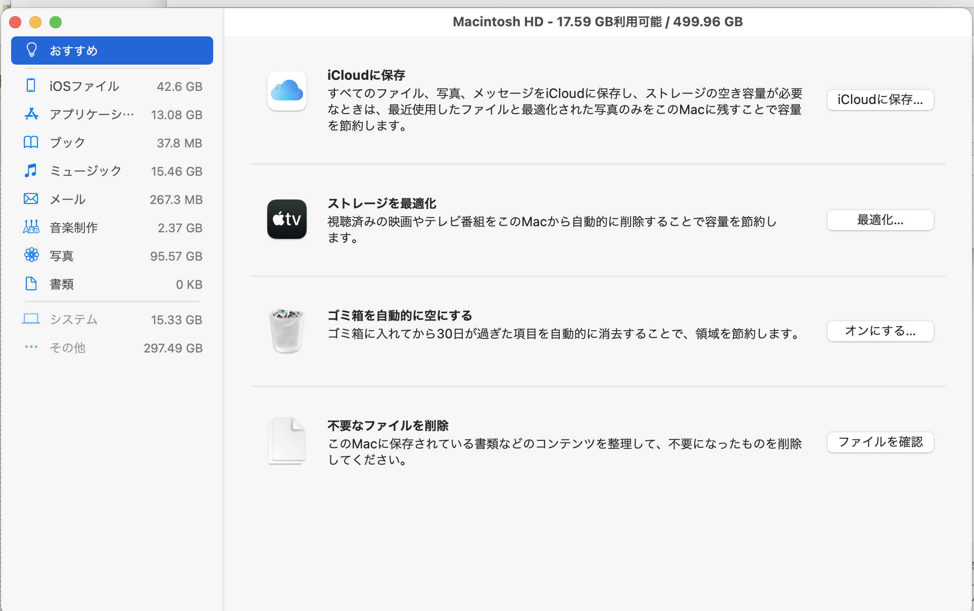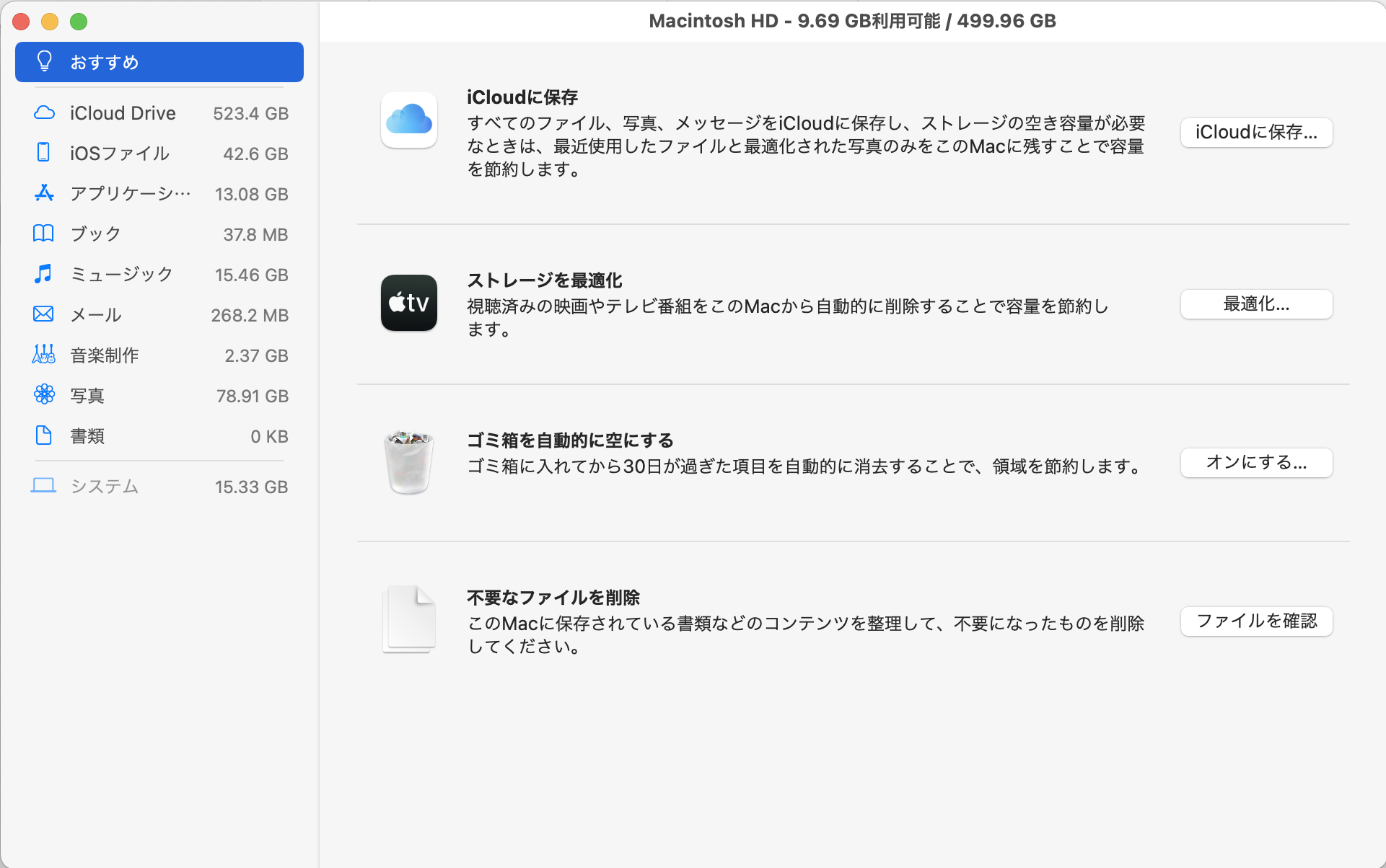 「Macのストレージを最適化』の項目にチェックをつけて、