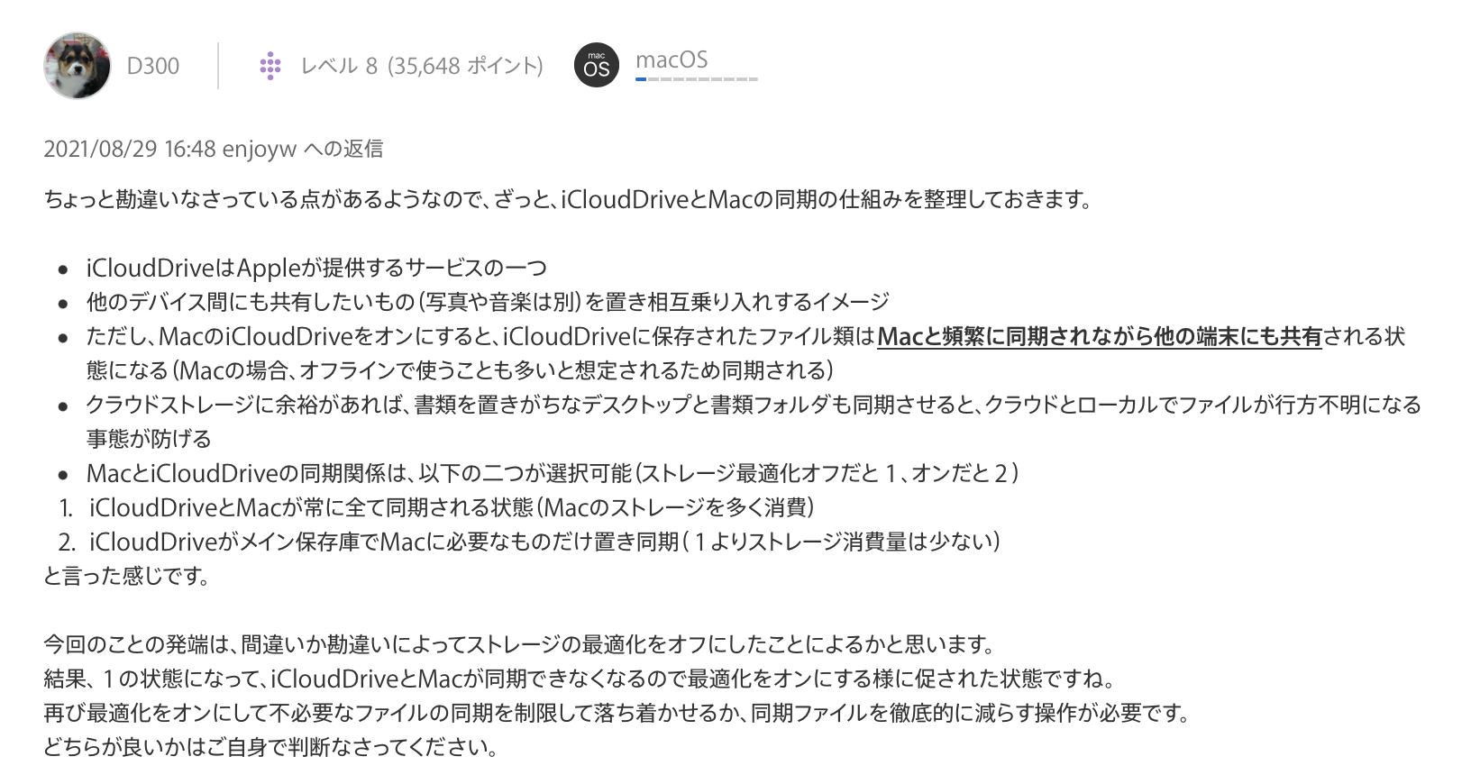 >ちょっと勘違いなさっている点があるようなので、ざっと、iCloudDriveとMacの同期の仕組みを整理しておきます。