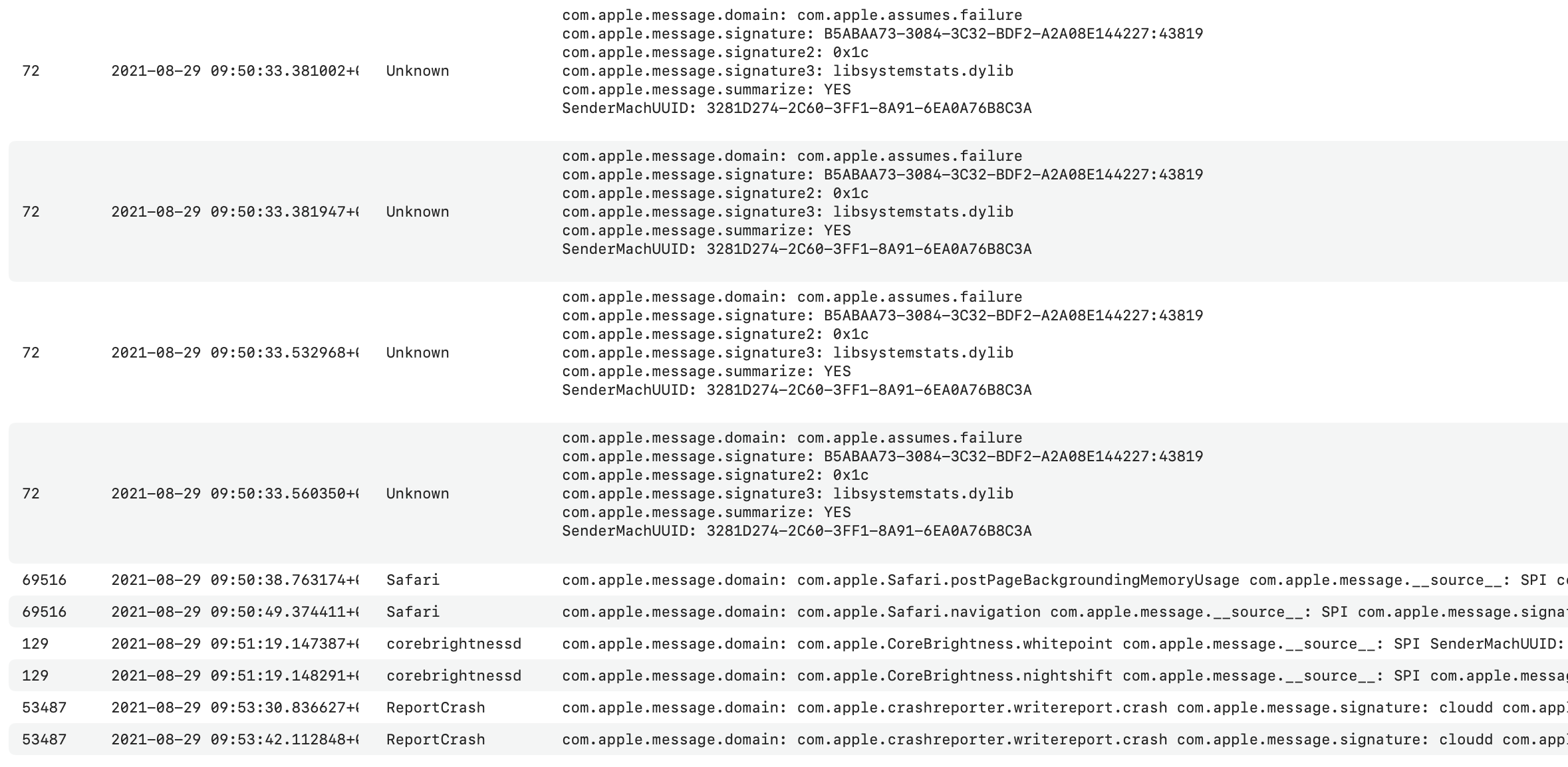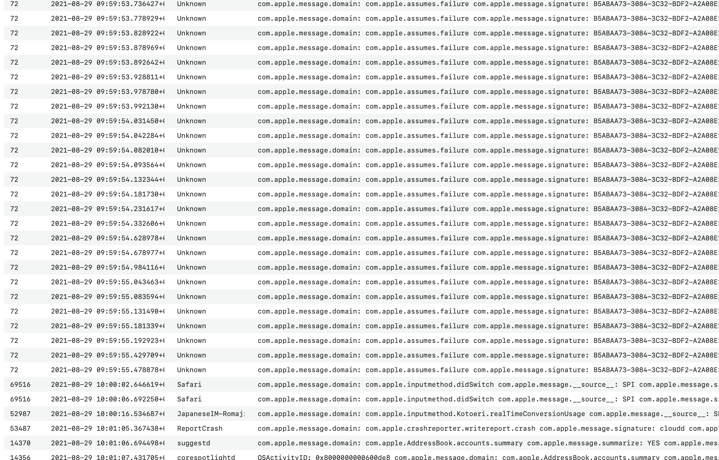 今日 29日の、09:50:33 の 560350 Unknownのログまでも、safariやcorebrightnessd,ReportCrashなども