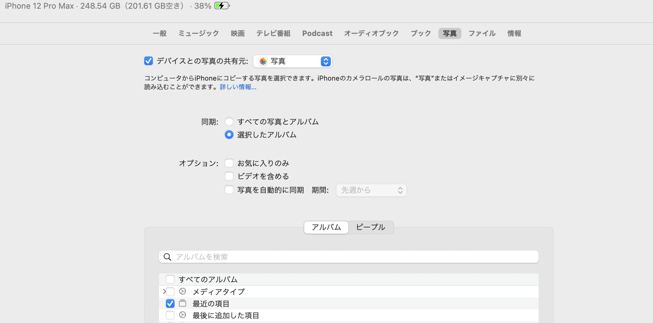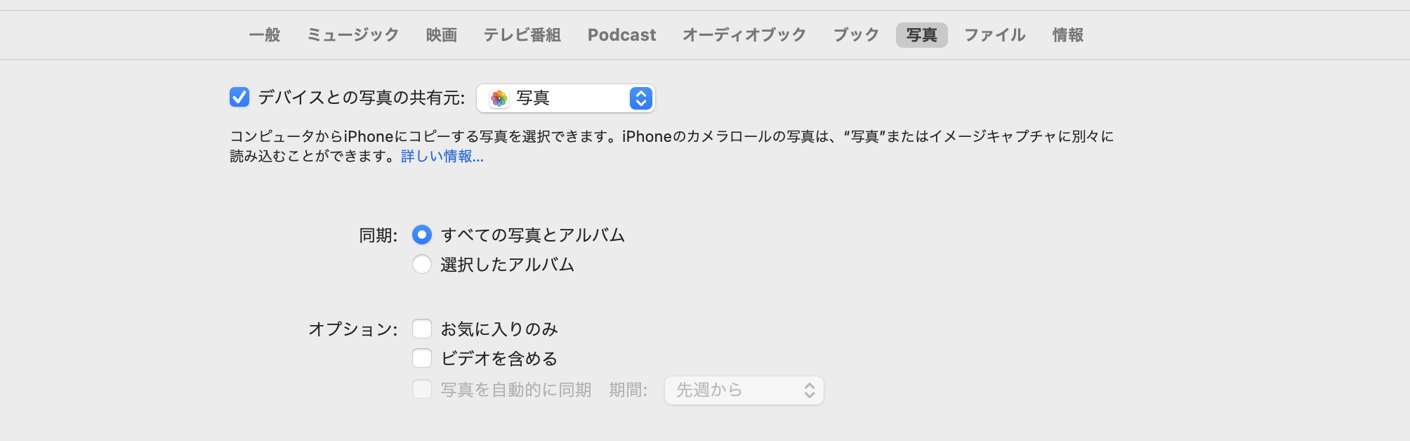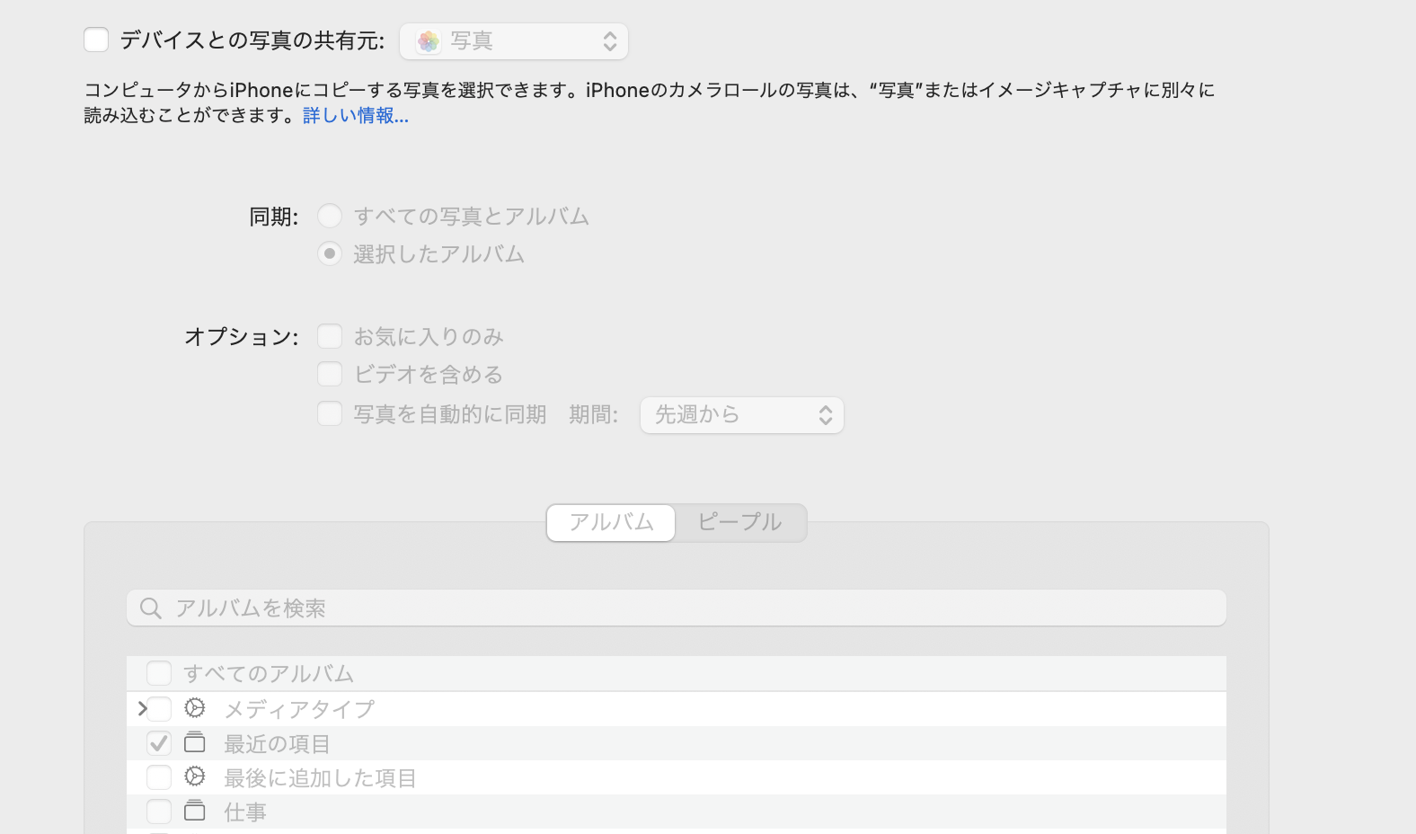 とりあえず、写真の同期は諦め、iPhoneがMacに接続されたら自動的に同期する項目もチェックを外し、