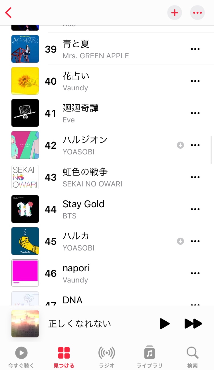 アップルミュージックのサブスクを今日登録して曲を追加しようとしたらライブラリに追加する+のボタンが無くなってしまいました。(画像の感じです)長押しからライブラリに入れることや全体を一気に入れる+ボタンはあるのですが、曲ごとに+ボタンが無いとかなり不便なのでどうにか戻したいです。どうすればいいでしょうか。使っている機種はiPhoneSE第2世代でiosのバージョンは最新です。再起動とサインアウトは試しましたが治りませんでした。