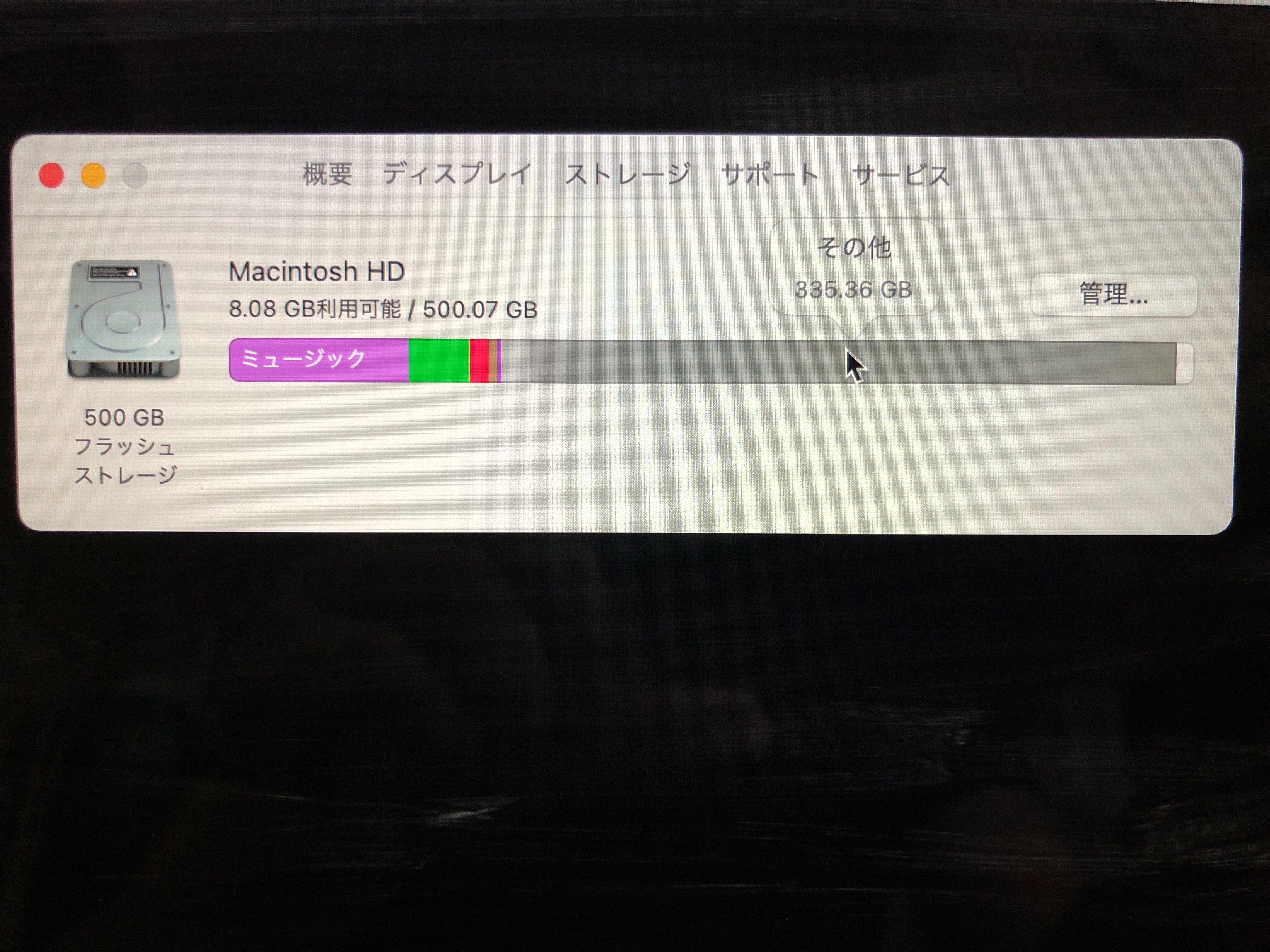 お示しのこのMacについてのストレージの画面に管理のボタンがありますが、これをクリックしてやっても、ある程度はいらないものを削除できます。ただ、この方法で削除しても、ストレージの画面の使用量にはすぐには反映しませんので注意が必要です。