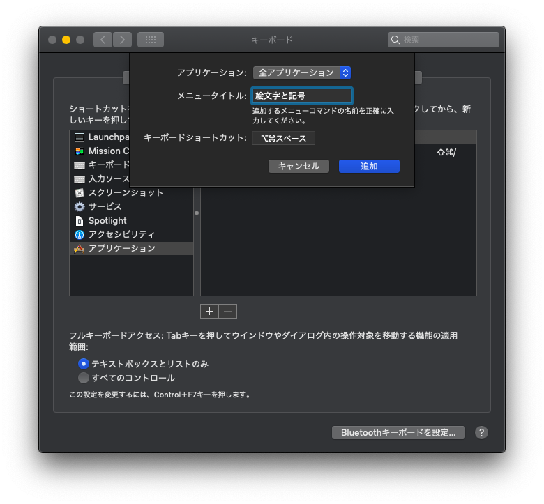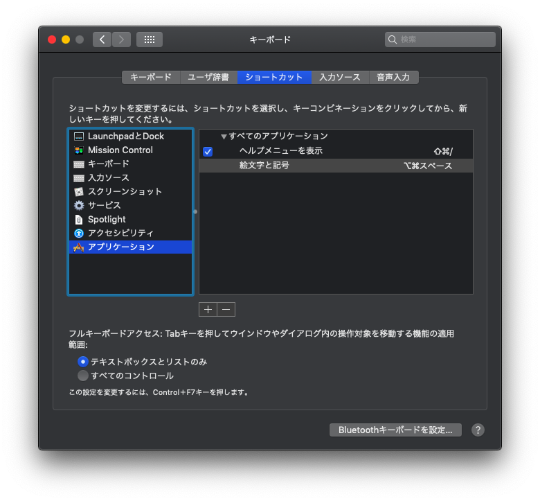 1.「システム環境設定」>「キーボード」>「ショートカット」タブ>左部リスト「アプリケーション」を選択。