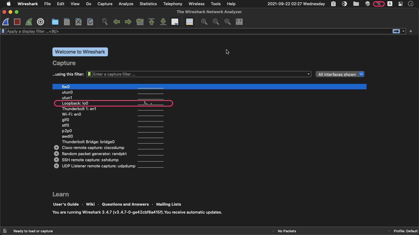 WiresharkでみるとLoopbackのトラフィックが上がり、それと共にActivity MonitorのSent/Rcvd Bytesが上がるのを確認しています。