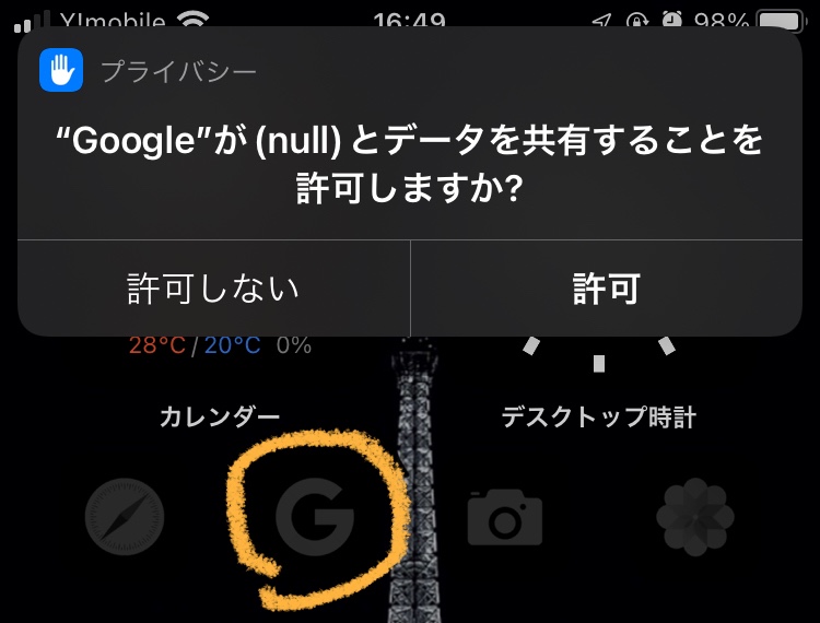 「"Goggle"が(null)とデータを共有することを許可しますか?