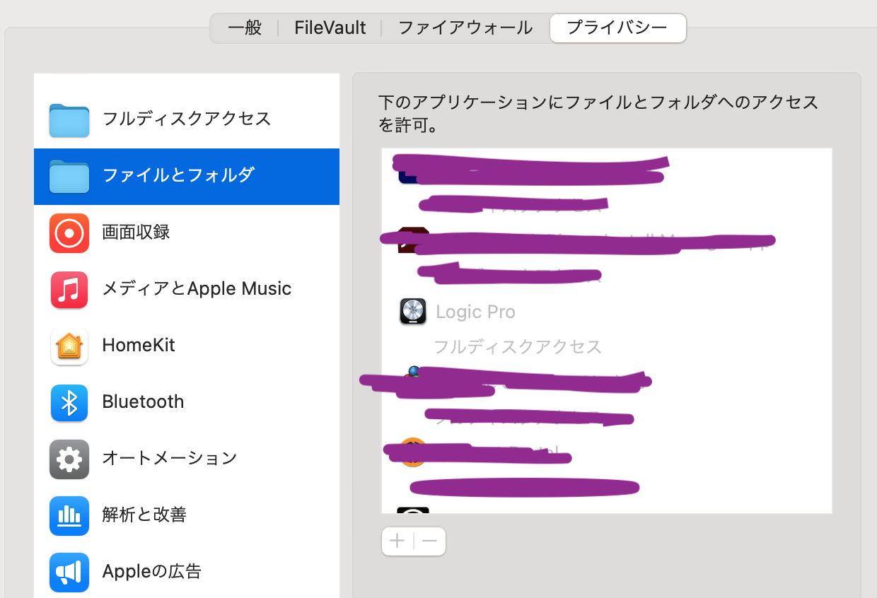 ・システム環境設定 > セキュリティとプライバシー > ファイルとフォルダ の項目では、アプリケーションの追加や削除もできない (以下の画像のような状況です)