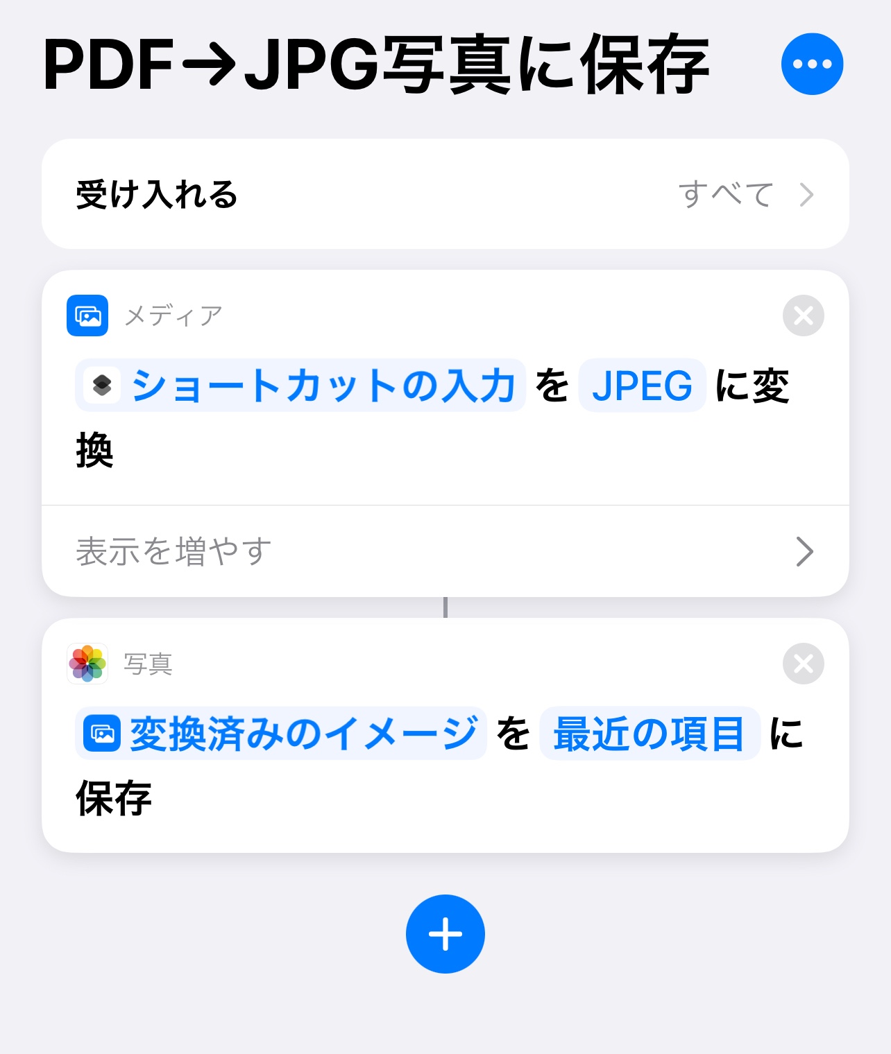 ショートカット自体はイメージの変換→クイックルックルック→フォトアルバムに保存で制作し共有から使えるようにしました。