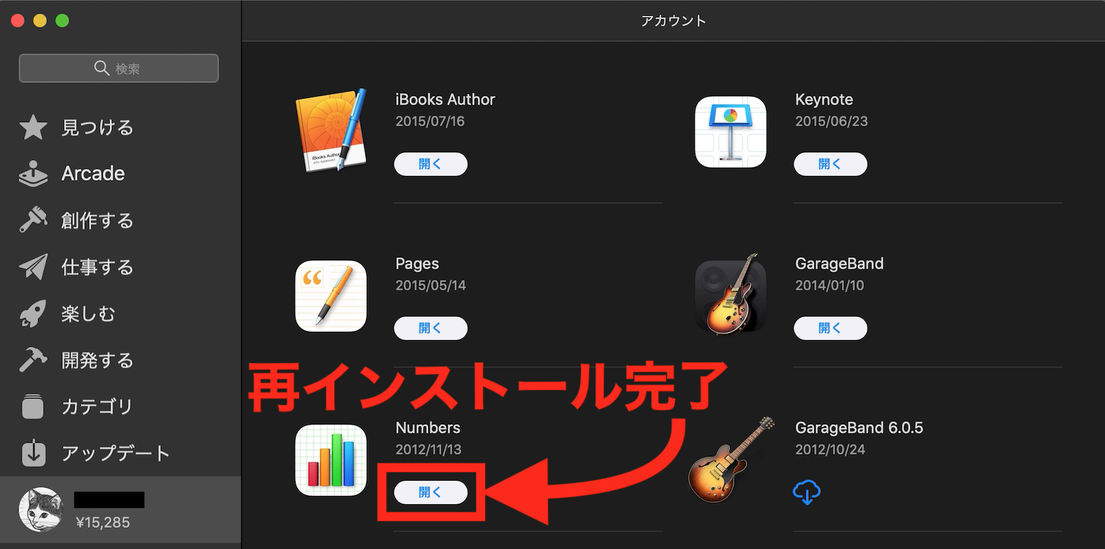 5.下の画像の様に、「Numbers」の右下に「開く」ボタンが表示されれば、再インストール完了です。