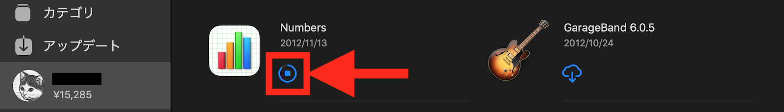 2.「」メニュー >「App Store」で Mac App Store を開き、下の画像の様に、サイドバーの「マイアカウント」をクリックすると表示される、「購入済み」画面で、「Numbers」の右下に表示されている「ダウンロード」アイコンをクリック。