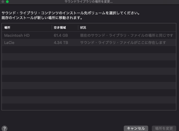 logic proのアップデートに伴い、サウンドライブラリのインストールを外部ストレージに行いたいのですが、ライブラリの場所の変更ができません。