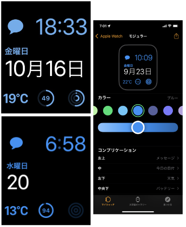 画像左上が元の状態、左下が今の状態、右がiPhone側のWatchアプリの設定画面です。