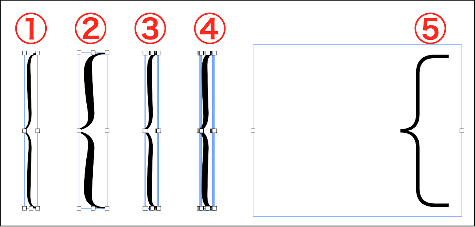 上の画像の ⑤ は、テキストボックスに{ を入力し、「フォーマット」インスペクタ >「テキスト」タブ >「スタイル」タブ >「フォント」セクションで、「ヒラギノ角ゴシック」、「W0」に設定した物ですが、「ヒラギノ角ゴシック」、「W0」であれば、フォントサイズを大きくしても、極々太にはならない かと思います。