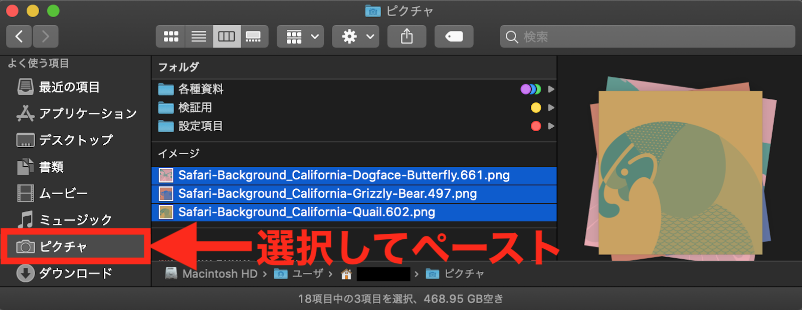 「Finder」のサイドバーで、「ピクチャ」フォルダを選択して「command」+「V」キーでペースト。