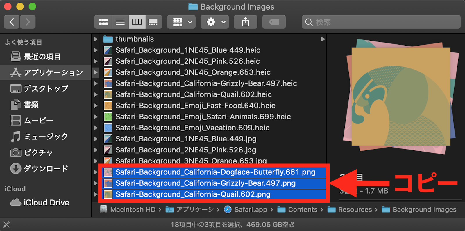 「Background Images」フォルダ内の、以下の3つの画像ファイルを「command」+「C」キーでコピー。