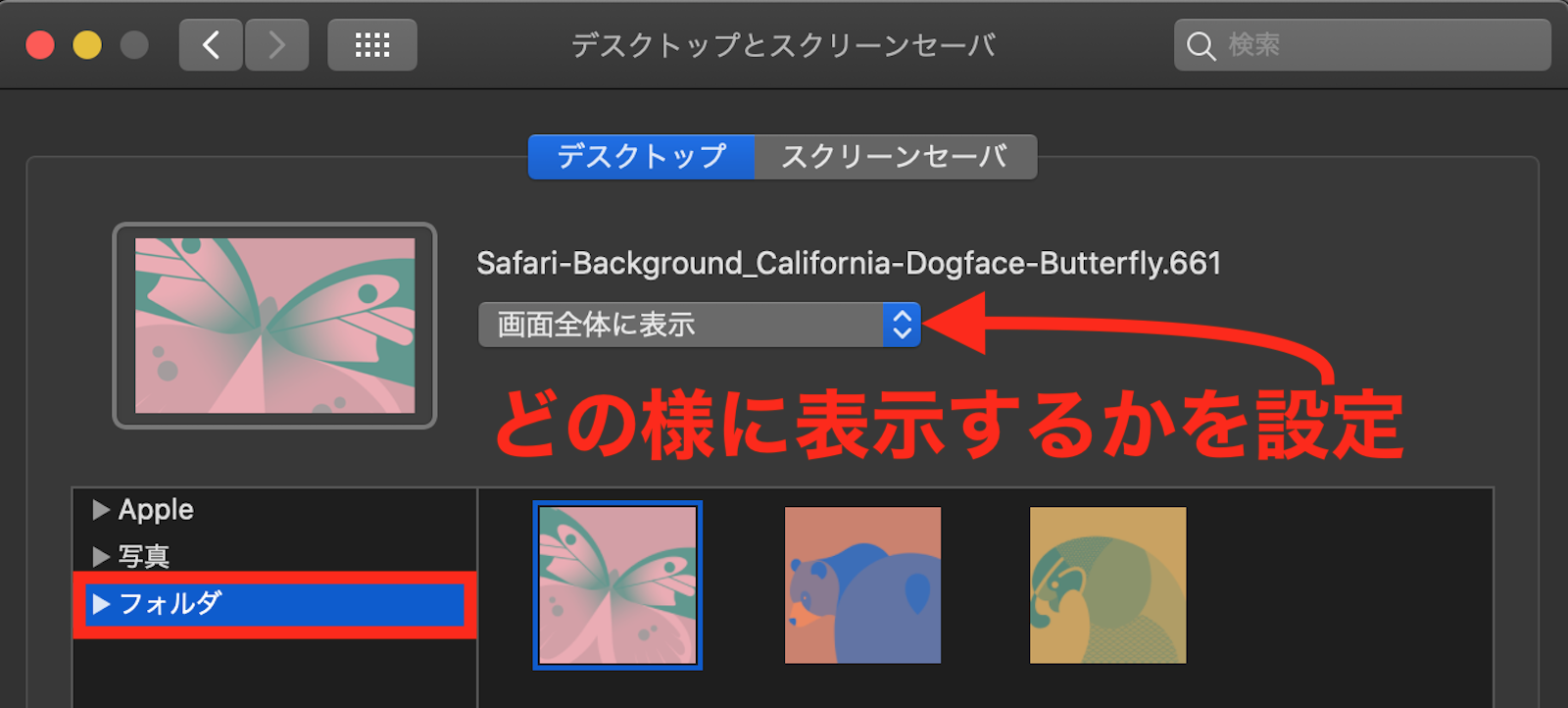 下の画像の様に、「システム環境設定」>「デスクトップとスクリーンセーバ」>「デスクトップ」タブのサイドバーで、「フォルダ」を選択すると、「ピクチャ」フォルダにコピー&ペーストした3つの画像ファイルが表示されますので、壁紙にしたいイメージを選択すると、デスクトップピクチャが選択したイメージに変わります。