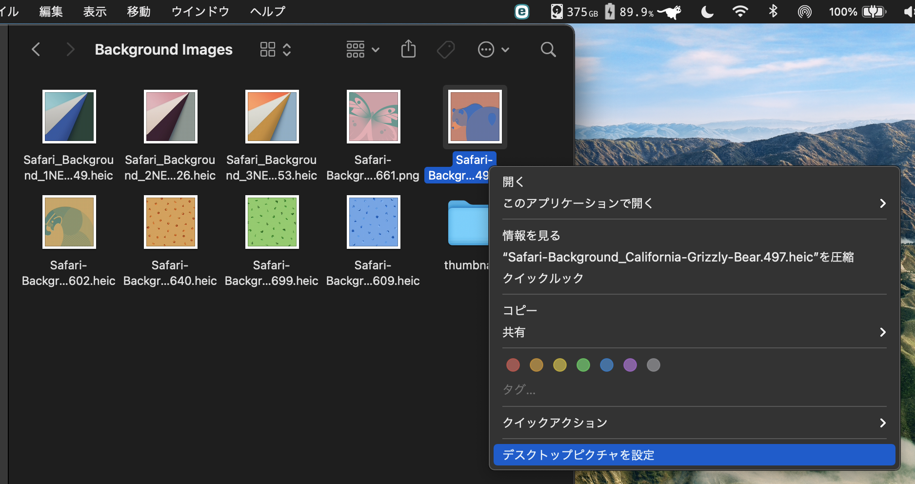 開いたフォルダからお好みの画像を選択して、右クリック(副ボタンクリック=2本指でクリック)してコンテキストメニューを出します。