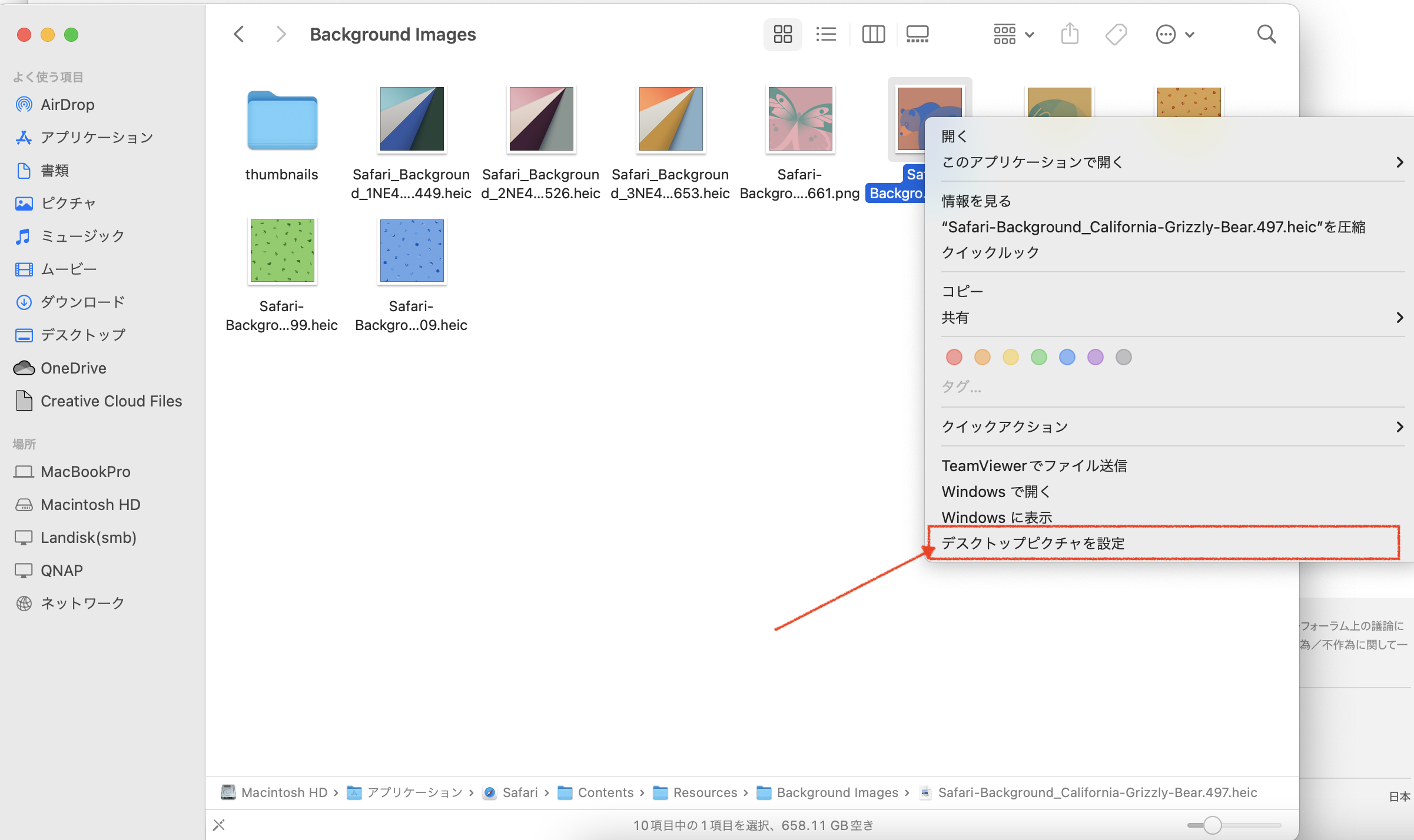 イメージファイルの場所さえわかれば、あとはそこでコンテキストメニューから”デスクトップピクチャを設定”をクリックするだけなんですけどね。