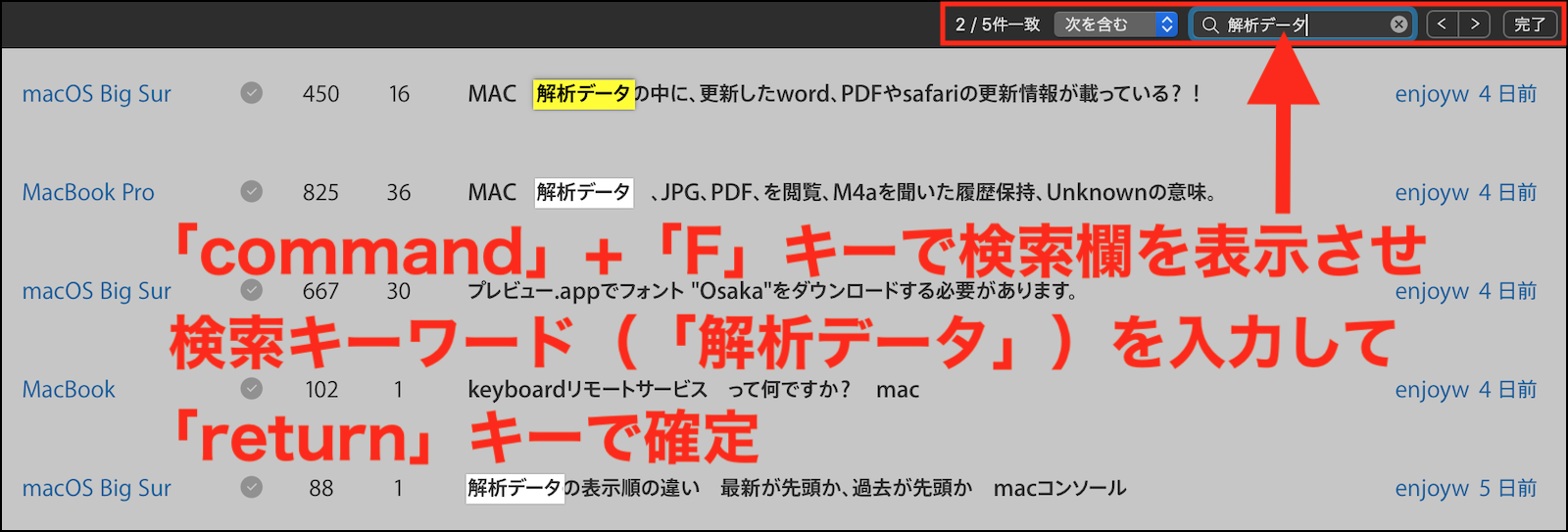 3.下の画像の様に、「command」+「F」キーで検索欄を表示させ、検索キーワード(今回は「解析データ」)を入力して「return」キーを押すと、タイトルに検索キーワード(「解析データ」)を含むスレッドが、ハイライト表示されますので、選択して内容を確認して下さい。