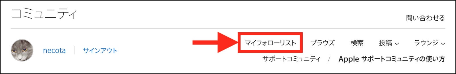 1.下の画像の様に、Apple サポートコミュニティの画面上部に有る、「マイフォローリスト」をクリック。