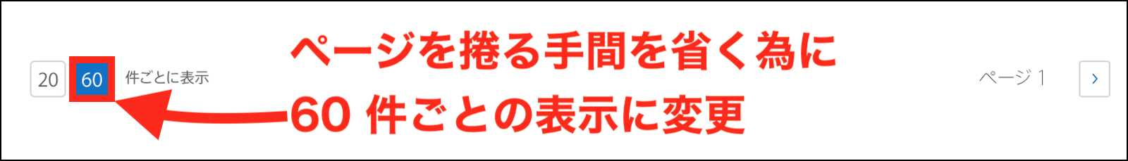 2.表示されるページの一番下までスクロールし、ページを捲る手間を省く為、下の画像の様に「60 件ごとに表示」に変更。
