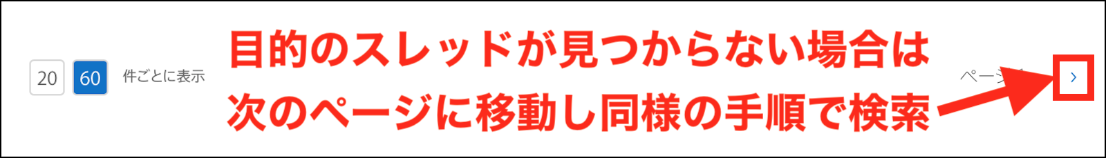 4.もし、検索したページで、目的のスレッドが見つからない場合は、ページの一番下までスクロールし、下の画像の様にページ右下に有る「>」アイコンをクリックして次のページに移動し、同様の手順で検索して見て下さい。