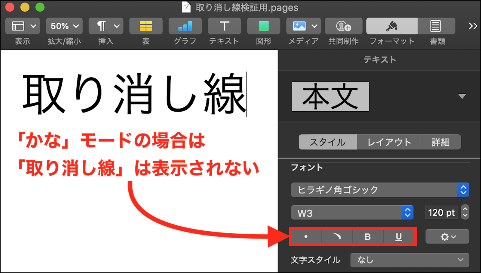 日本語入力の場合でも、一旦 「英数」モードにすれば、「取り消し線」ボタンが表示されます。