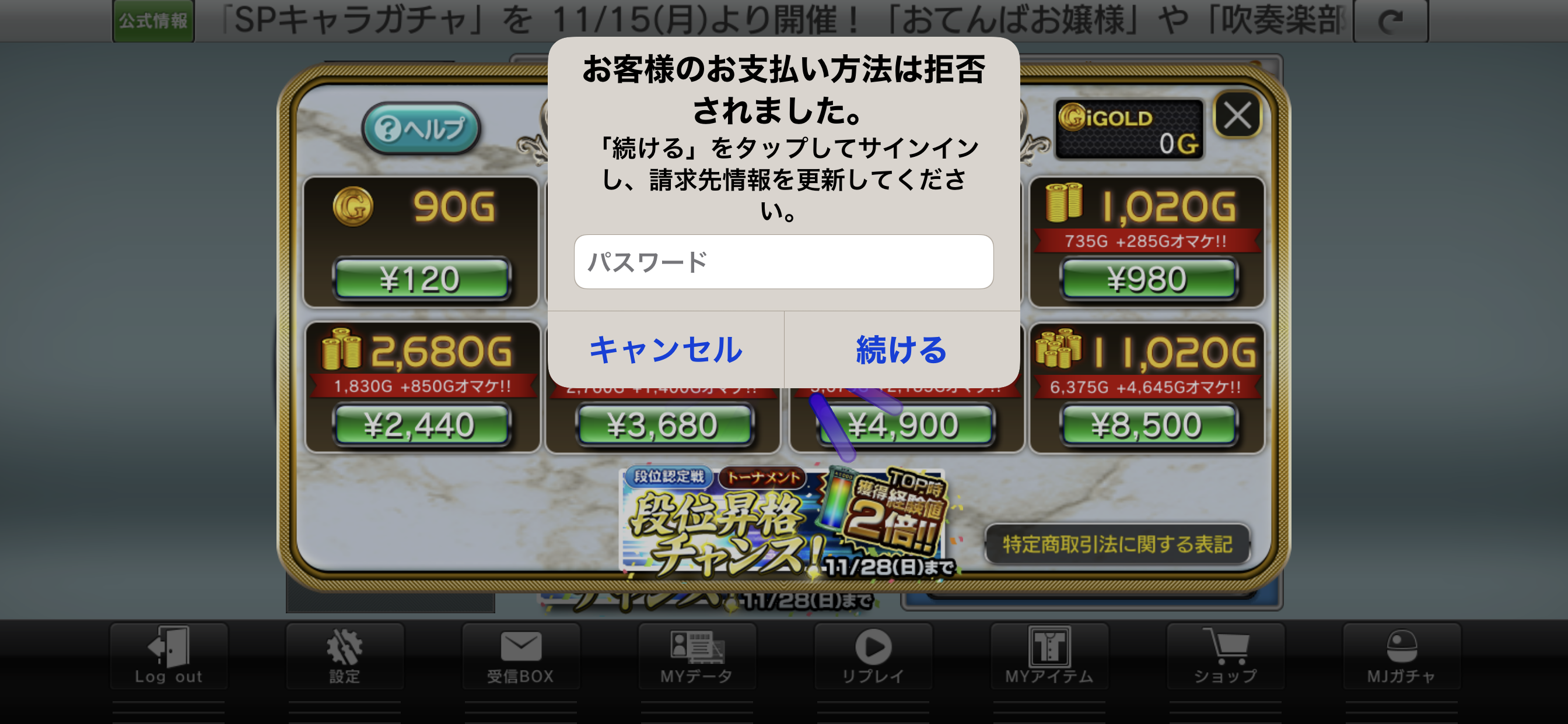 そのアプリ(mj麻雀)でアイテム購入しようとするとき、何かエラーになるなら、そのエラーメッセージを明記すると、詳しい人から情報があるかも。