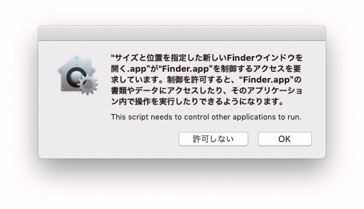 “自作のAppleScriptアプリケーション名”が“Finder.app”を制御するアクセスを要求しています。制御を許可すると、“Finder.app”の書類やデータにアクセスしたり、そのアプリケーション内で操作を実行したりできるようになります。