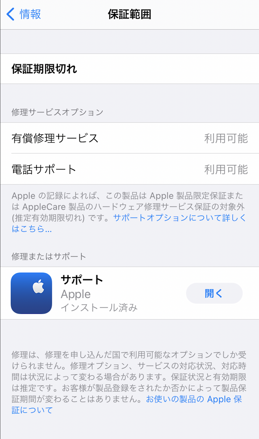 設定アプリ > 一般 > 情報 > 保証期限切れをタップしたところに、どのように書いてありますか?